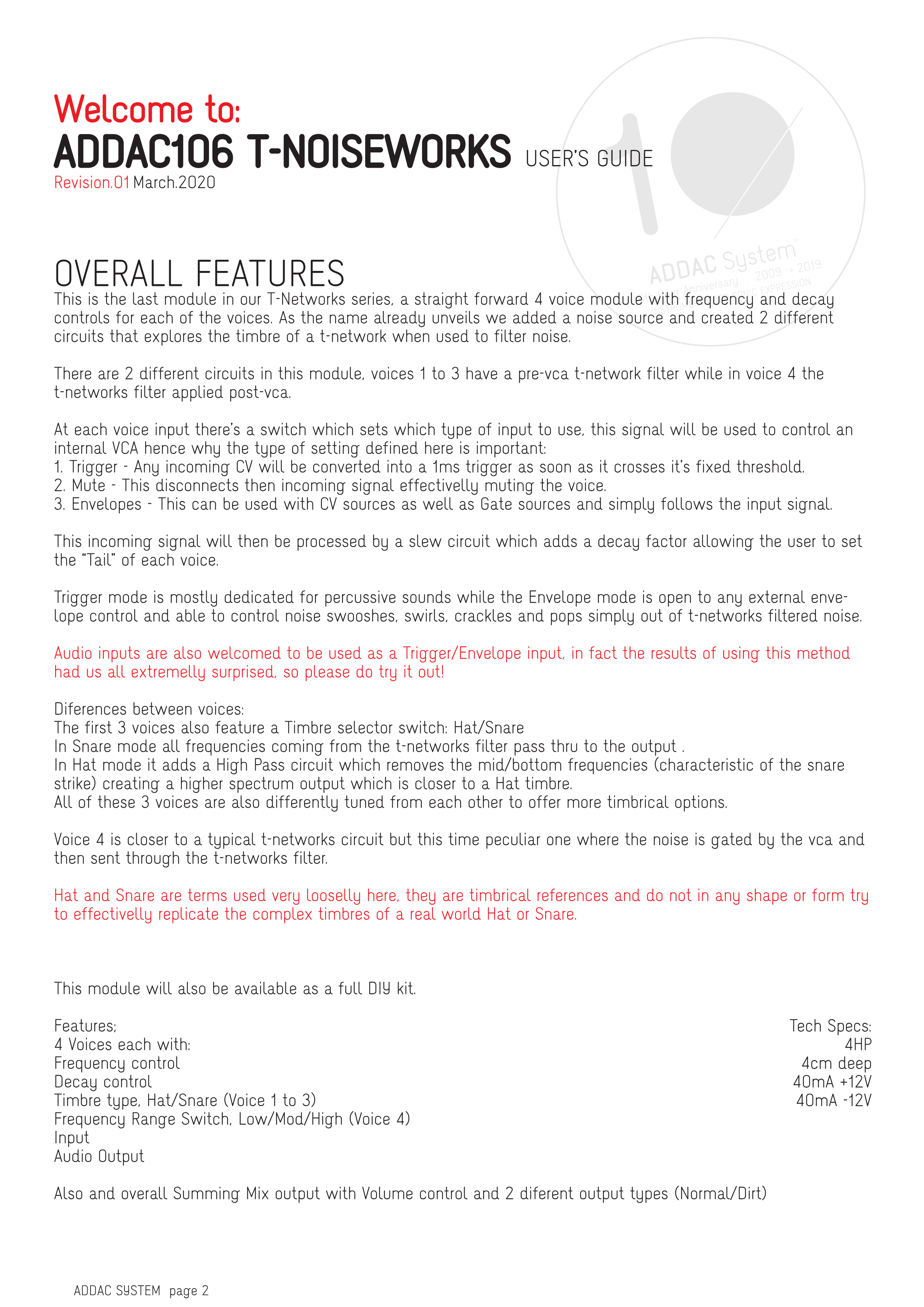 これはT-Networksシリーズの最後のモジュールで、各ボイスにFrequencyとDecayコントロールを備えた4ボイス構成のストレートフォワードなモジュールです。名前が示すように、ノイズソースを追加し、ノイズをフィルタリングする際のT-networkのティンバーを探求する2つの異なる回路を作成しました。