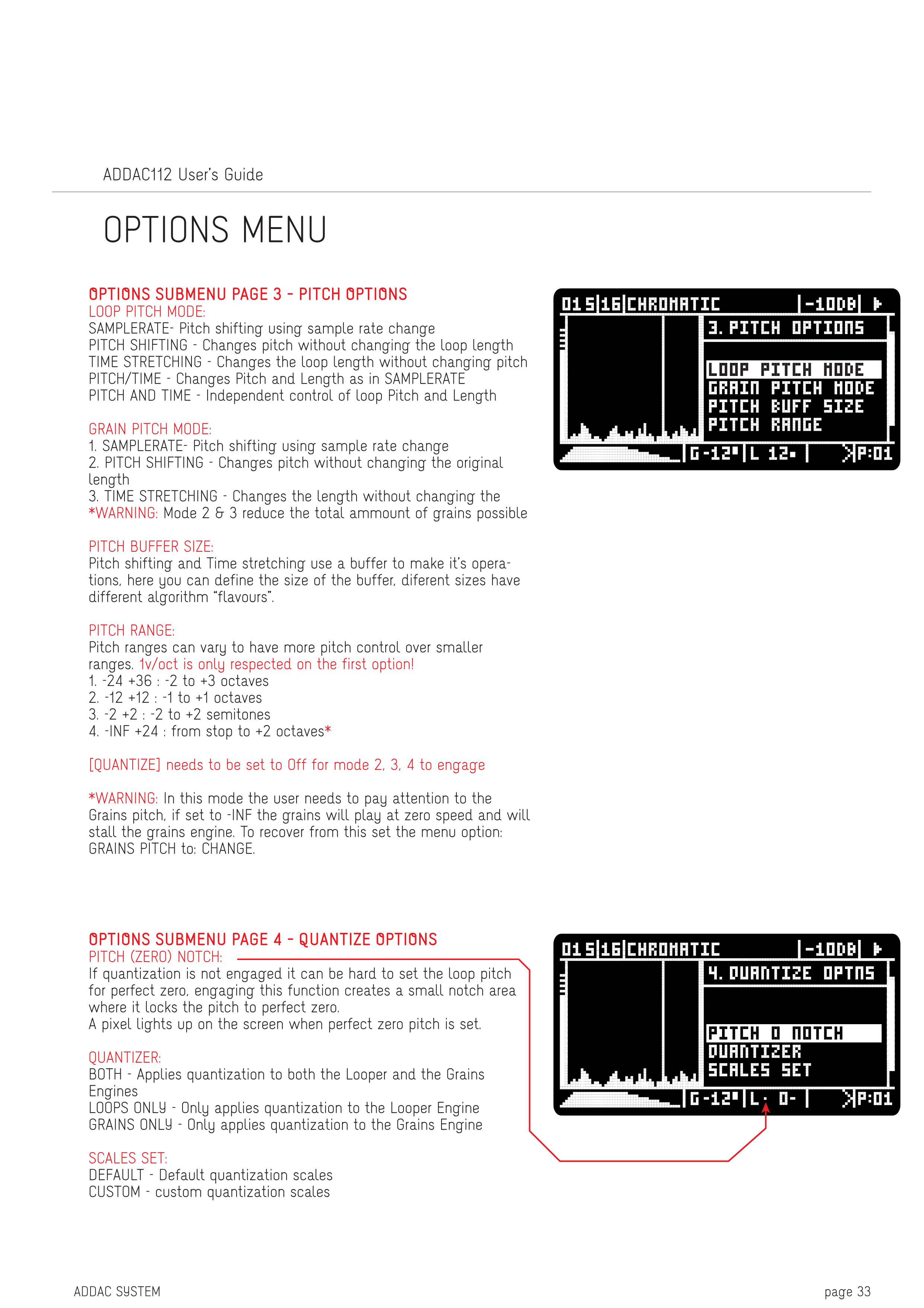 *警告: このモードでは、Grainのピッチに注意する必要があります。-INFに設定すると、Grainはゼロ速度で再生され、Grainエンジンが停止します。これを回復するには、メニューオプションのGRAINS PITCHをCHANGEに設定してください。