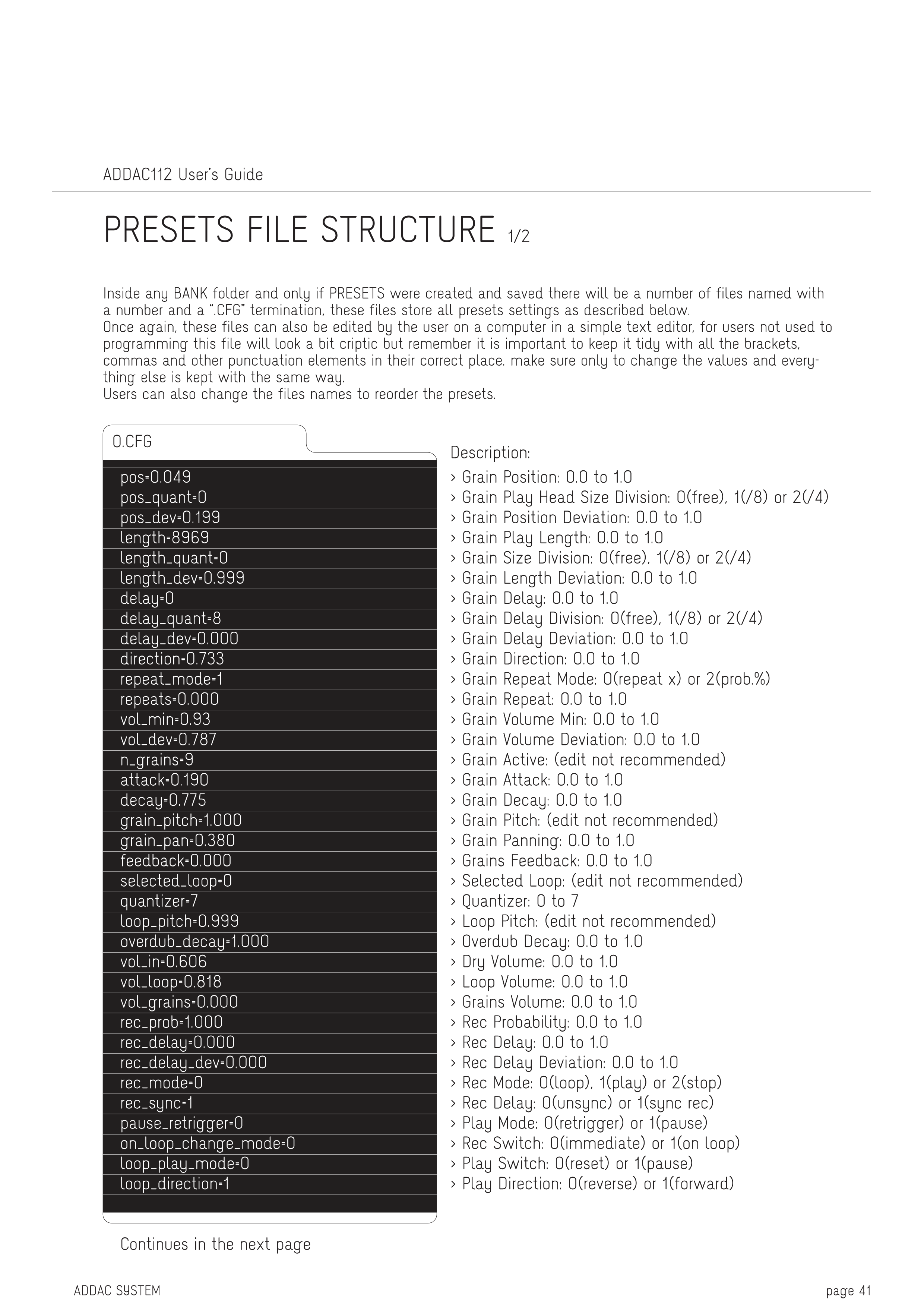 Grain Position: 0.0 ~ 1.0 Grain Play Head Size Division: 0(free)、1(/8)、または2(/4) Grain Position Deviation: 0.0 ~ 1.0 Grain Play Length: 0.0 ~ 1.0 Grain Size Division: 0(free)、1(/8)、または2(/4) Grain Length Deviation: 0.0 ~ 1.0 Grain Delay: 0.0 ~ 1.0 Grain Delay Division: 0(free)、1(/8)、または2(/4) Grain Delay Deviation: 0.0 ~ 1.0 Grain Direction: 0.0 ~ 1.0 Grain Repeat Mode: 0(repeat x)、または2(prob.%) Grain Repeat: 0.0 ~ 1.0 Grain Volume Min: 0.0 ~ 1.0 Grain Volume Deviation: 0.0 ~ 1.0 Grain Active: (編集は推奨されません) Grain Attack: 0.0 ~ 1.0 Grain Decay: 0.0 ~ 1.0 Grain Pitch: (編集は推奨されません) Grain Panning: 0.0 ~ 1.0 Grains Feedback: 0.0 ~ 1.0 Selected Loop: (編集は推奨されません) Quantizer: 0 ~ 7 Loop Pitch: (編集は推奨されません) Overdub Decay: 0.0 ~ 1.0 Dry Volume: 0.0 ~ 1.0 Loop Volume: 0.0 ~ 1.0 Grains Volume: 0.0 ~ 1.0 Rec Probability: 0.0 ~ 1.0 Rec Delay: 0.0 ~ 1.0 Rec Delay Deviation: 0.0 ~ 1.0 Rec Mode: 0(loop)、1(play)、または2(stop) Rec Delay: 0(unsync)、または1(sync rec) Play Mode: 0(retrigger)、または1(pause) Rec Switch: 0(immediate)、または1(on loop) Play Switch: 0(reset)、または1(pause) Play Direction: 0(reverse)、または1(forward)