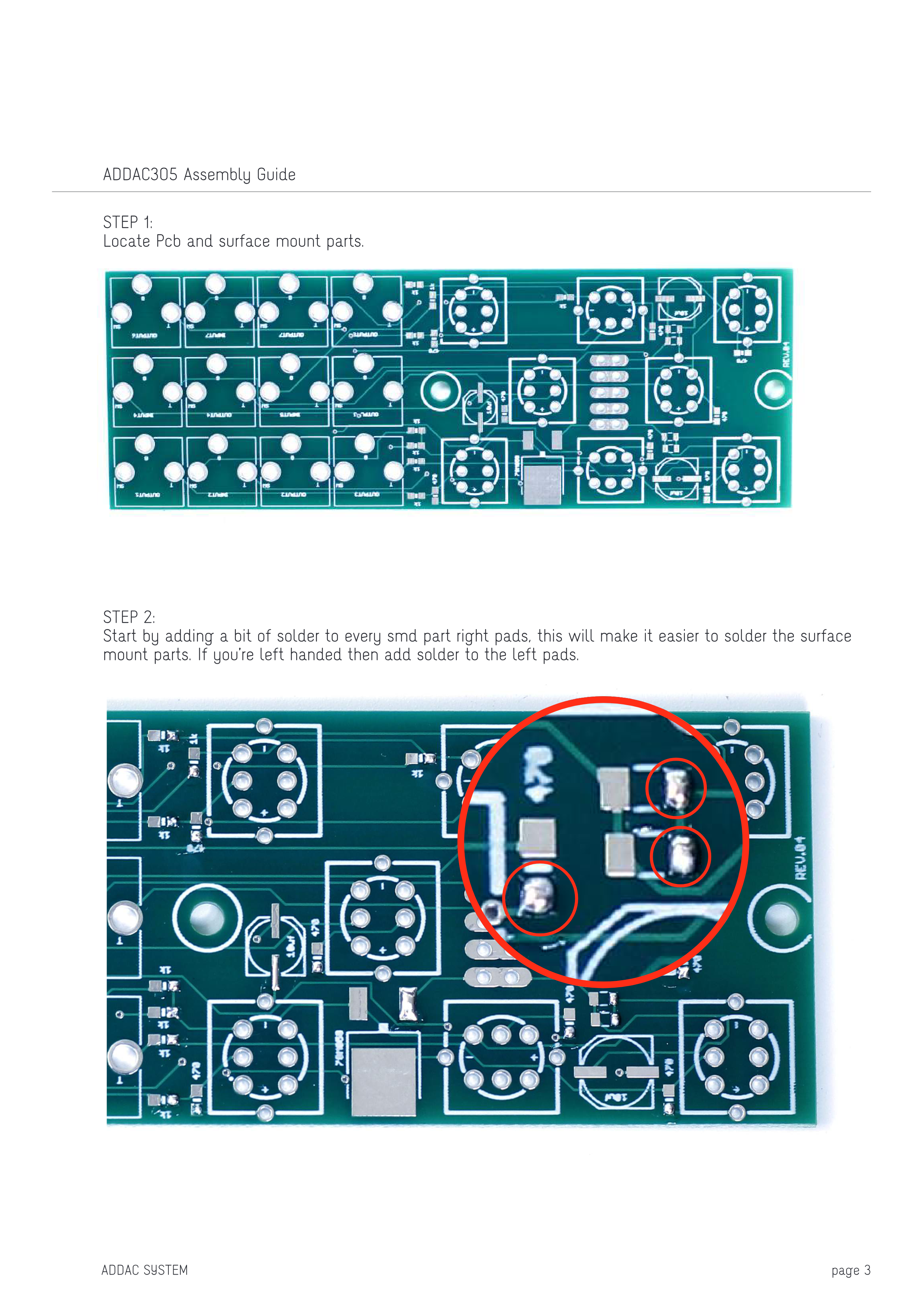 全ての表面実装部品の右側のパッドに少量のはんだを予め付けておきます。これにより表面実装部品のはんだ付けが容易になります。左利きの方は左側のパッドにはんだを付けてください。