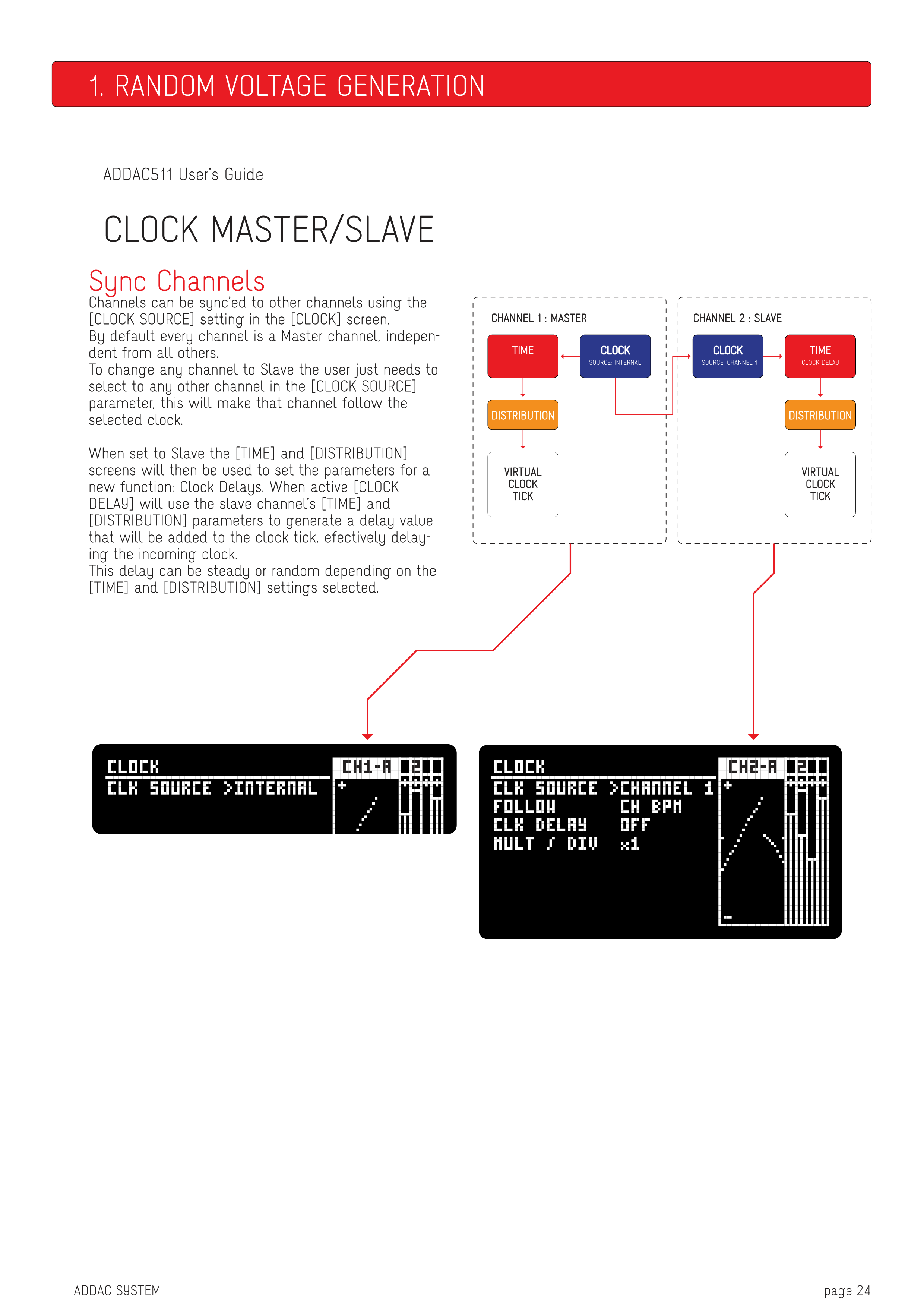 Slaveに設定すると、[TIME]と[DISTRIBUTION]画面は新しい機能であるClock Delaysのパラメーター設定に使用されます。[CLOCK DELAY]がアクティブになると、Slaveチャンネルの[TIME]と[DISTRIBUTION]パラメーターを使用して遅延値を生成し、クロックティックに加算されることで、受信クロックを効果的に遅延させます。