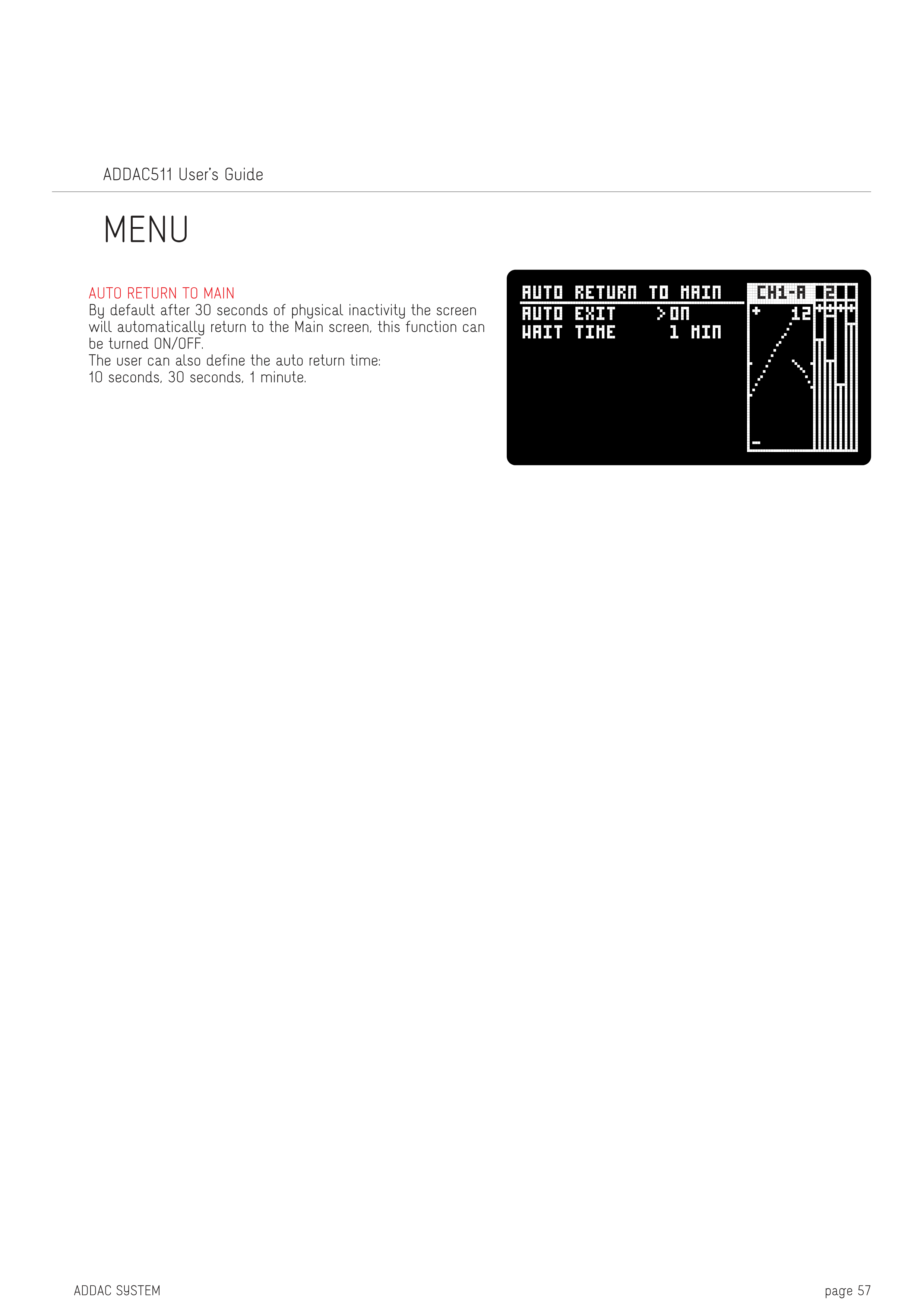 デフォルトでは、30秒間物理的な操作が行われないと、画面は自動的にメイン画面に戻ります。この機能はON/OFFの切り替えが可能です。