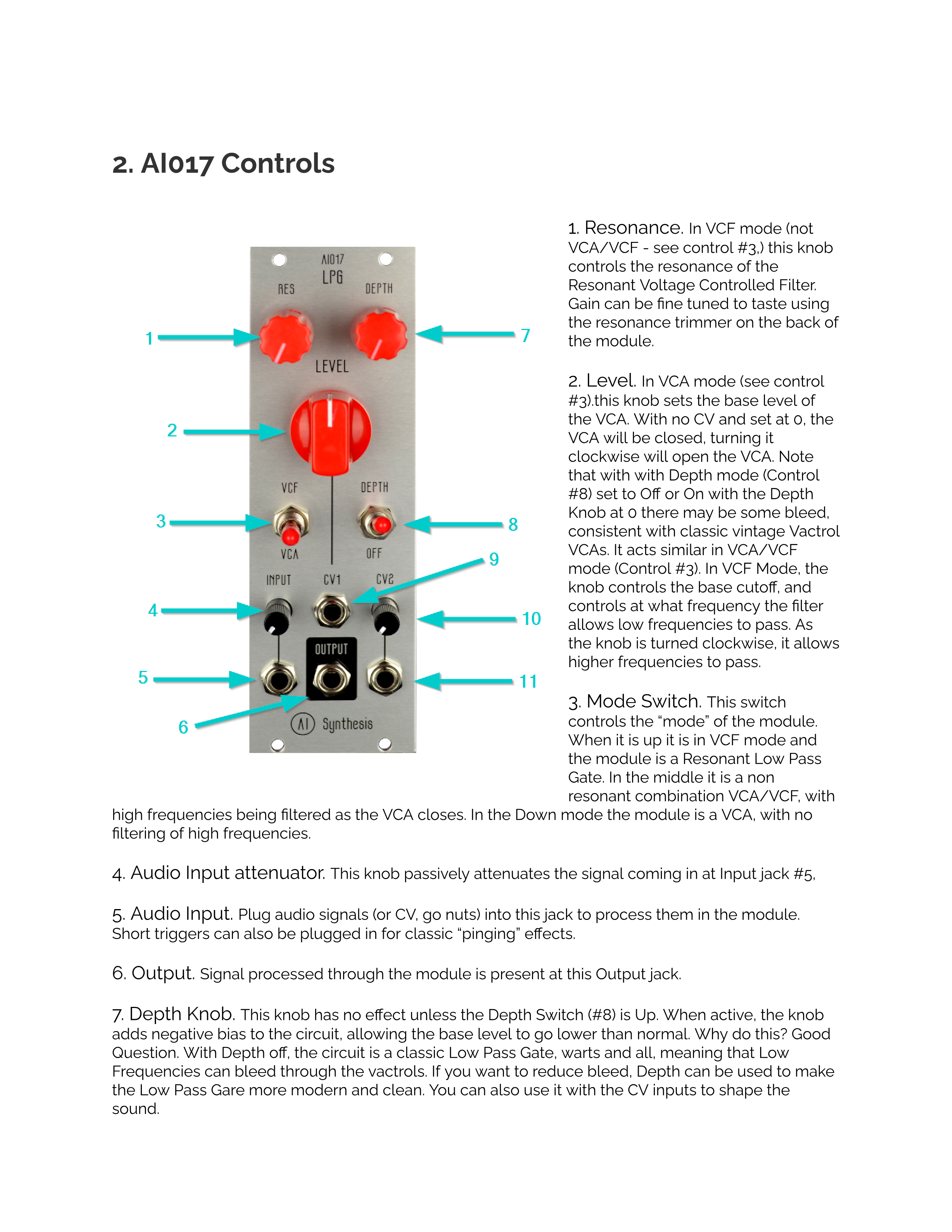 Depth Knob. このKnobは、Depth Switch(#8)が上の位置にない限り効果がありません。有効な場合、Knobは回路にネガティブバイアスを追加し、ベースレベルを通常よりも低くすることができます。なぜこれを行うのか?良い質問です。Depthがオフの場合、回路はクラシックなLow Pass Gateとなり、欠点も含めてすべてそのままです。つまり、低周波数がvactrolを通じてブリードする可能性があります。ブリードを減らしたい場合、DepthによってLow Pass Gateをよりモダンでクリーンにすることができます。CV入力と組み合わせて、サウンドを整形することもできます。