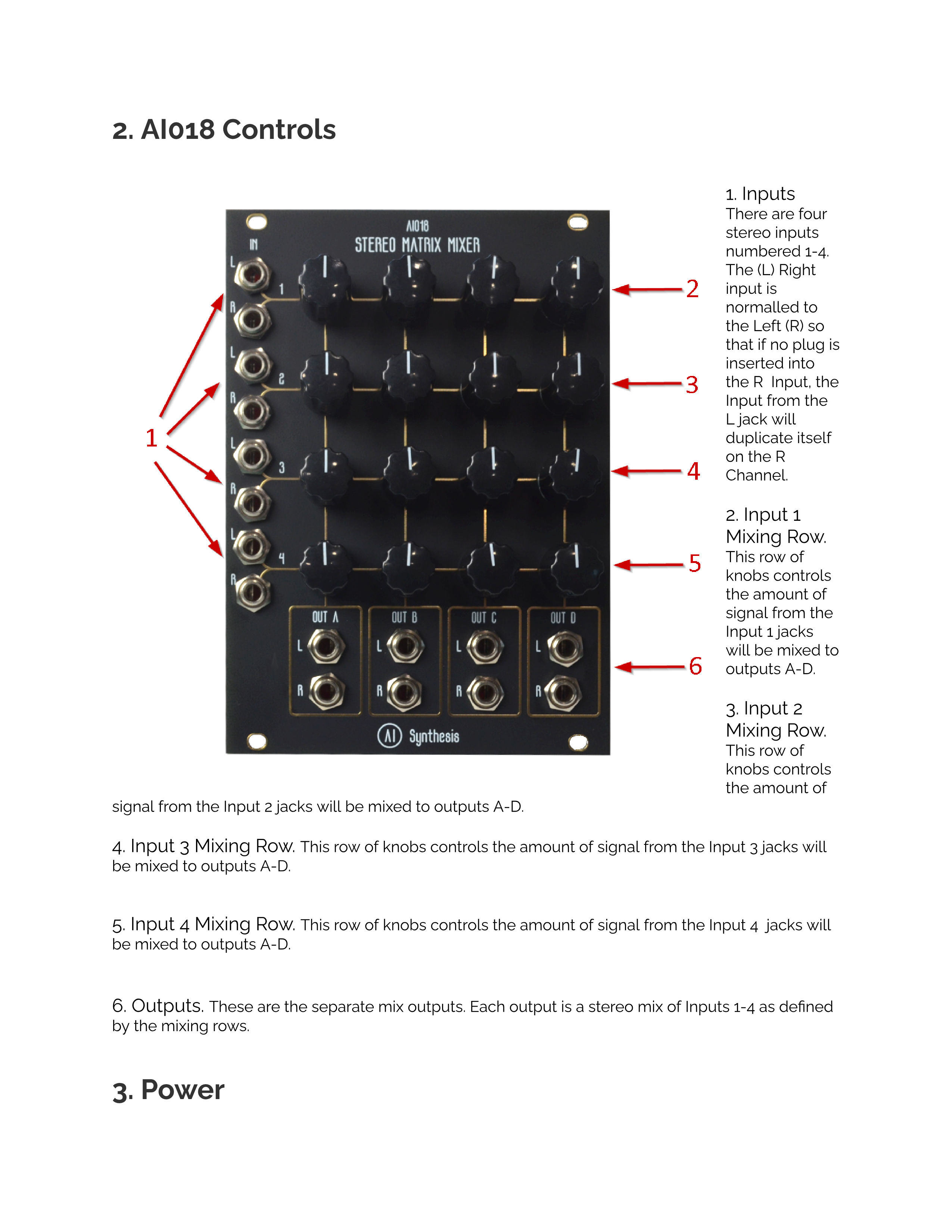 このKnobの列は、Input 3ジャックからの信号が出力A-Dにミックスされる量をコントロールします。