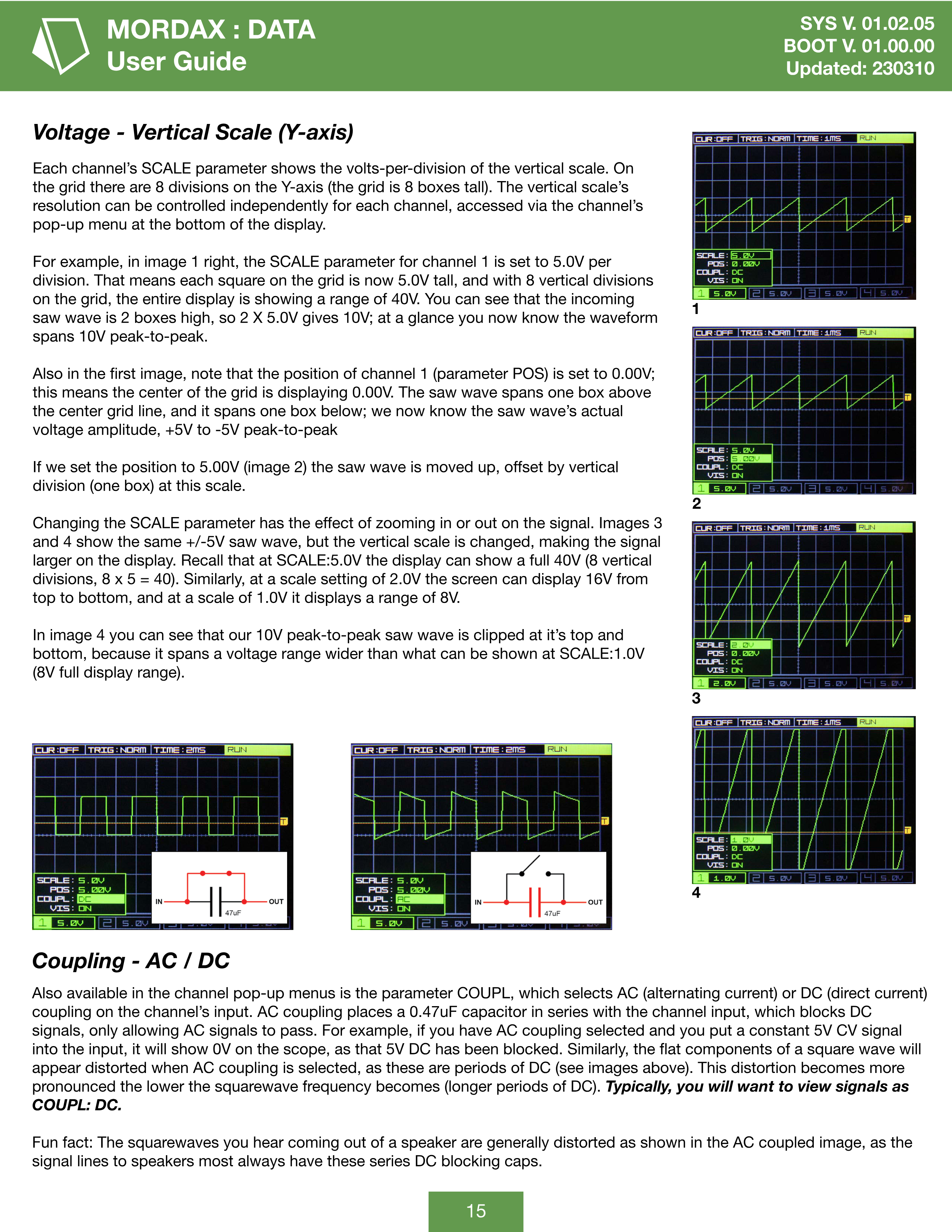 チャンネルのポップアップメニューには、COUPLパラメーターもあります。これはチャンネル入力のAC(交流)またはDC(直流)カップリングを選択します。ACカップリングはチャンネル入力と直列に0.47uFのコンデンサーを配置し、DC信号をブロックしてAC信号のみを通過させます。例えば、ACカップリングを選択した状態で5Vの一定CV信号を入力すると、そのDC 5Vがブロックされるためスコープには0Vが表示されます。同様に、矩形波のフラットな部分はACカップリング選択時に歪んで見えます(これらはDCの期間であるため、上記の画像参照)。この歪みは矩形波の周波数が低くなるほど(DCの期間が長くなるほど)顕著になります。通常は、COUPL: DCで信号を表示することをお勧めします。