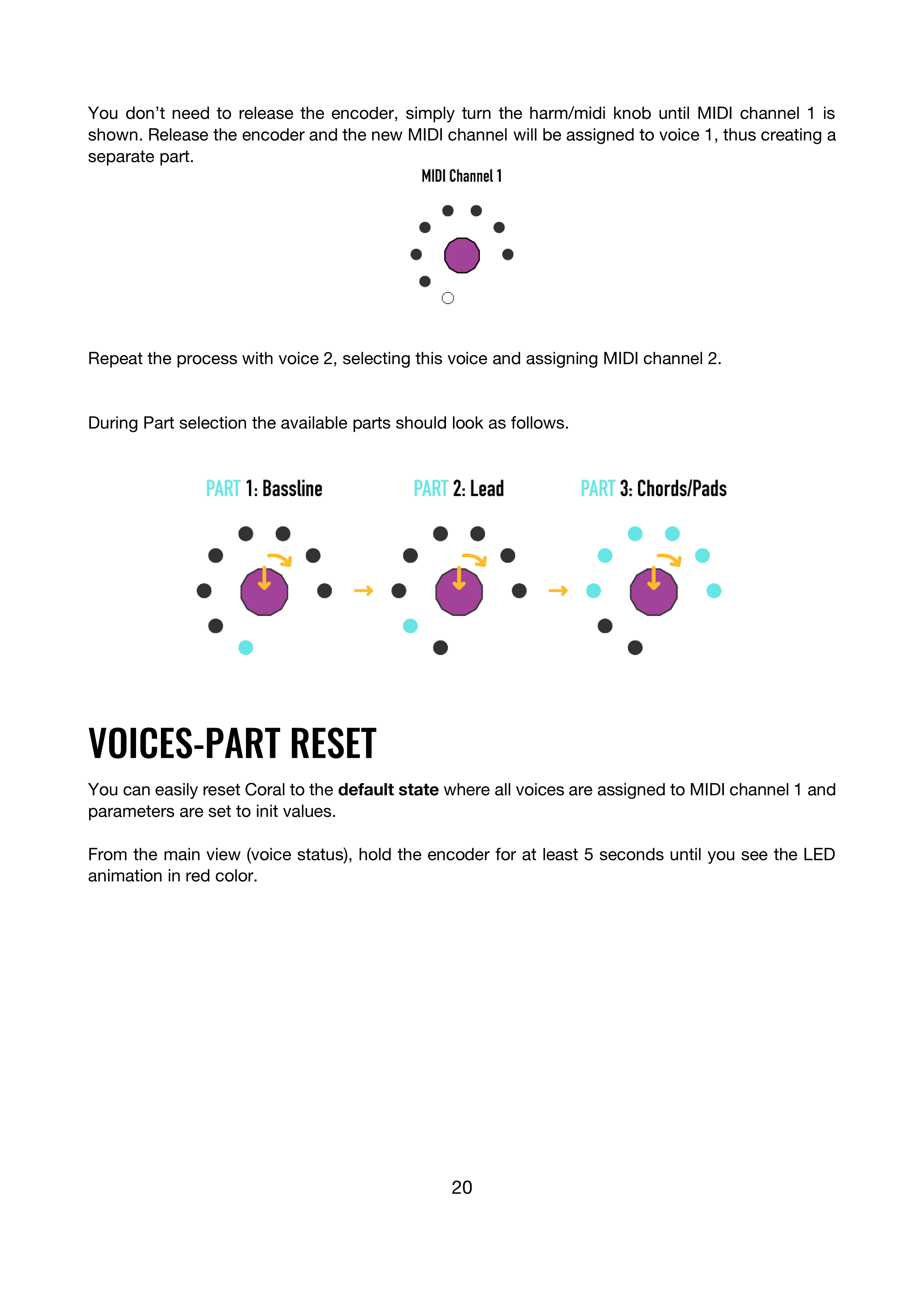 すべてのvoiceがMIDI channel 1に割り当てられ、パラメーターが初期値に設定されたデフォルト状態に、Coralを簡単にリセットできます。