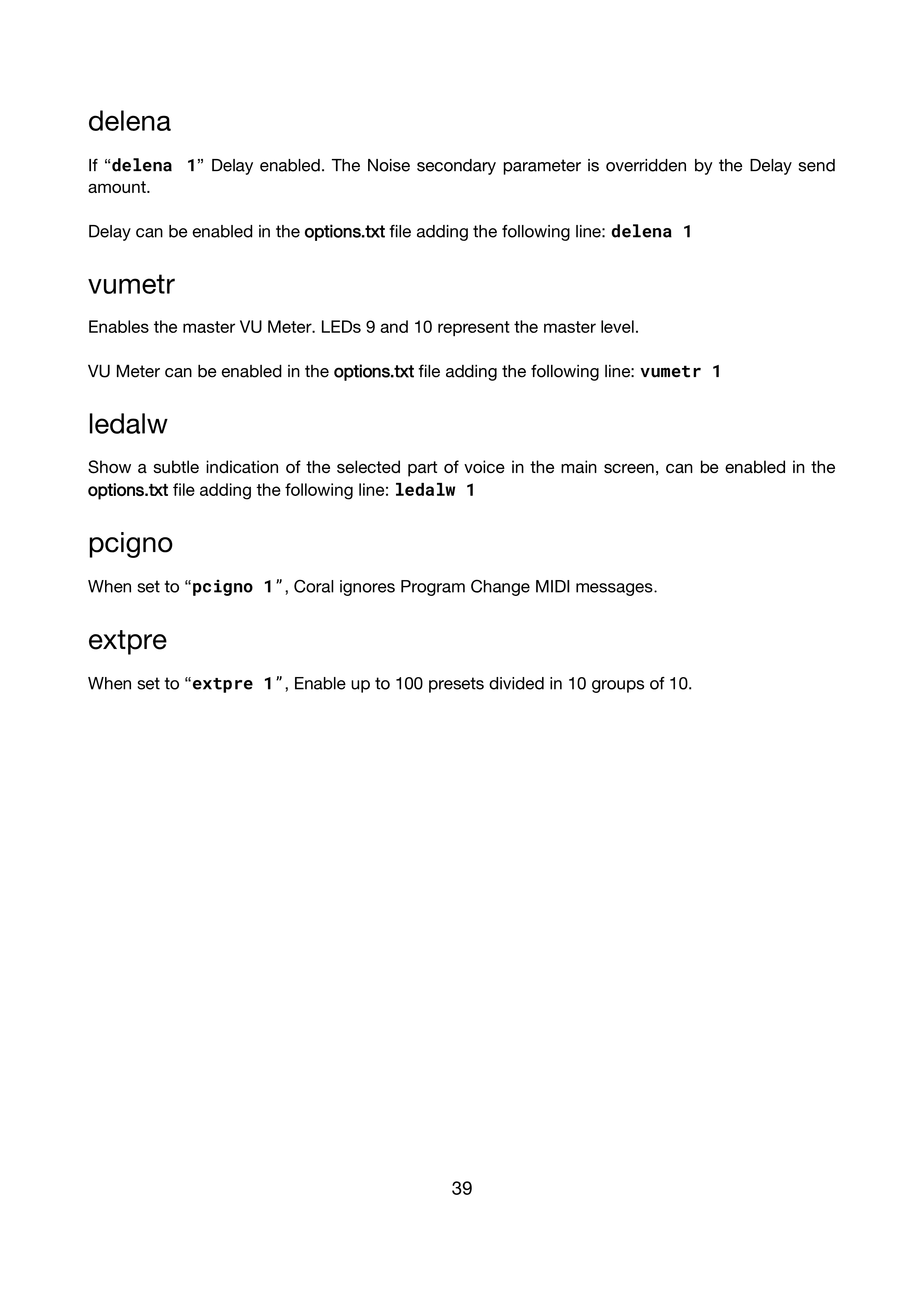 "pcigno 1"に設定すると、CoralはProgram Change MIDIメッセージを無視します。