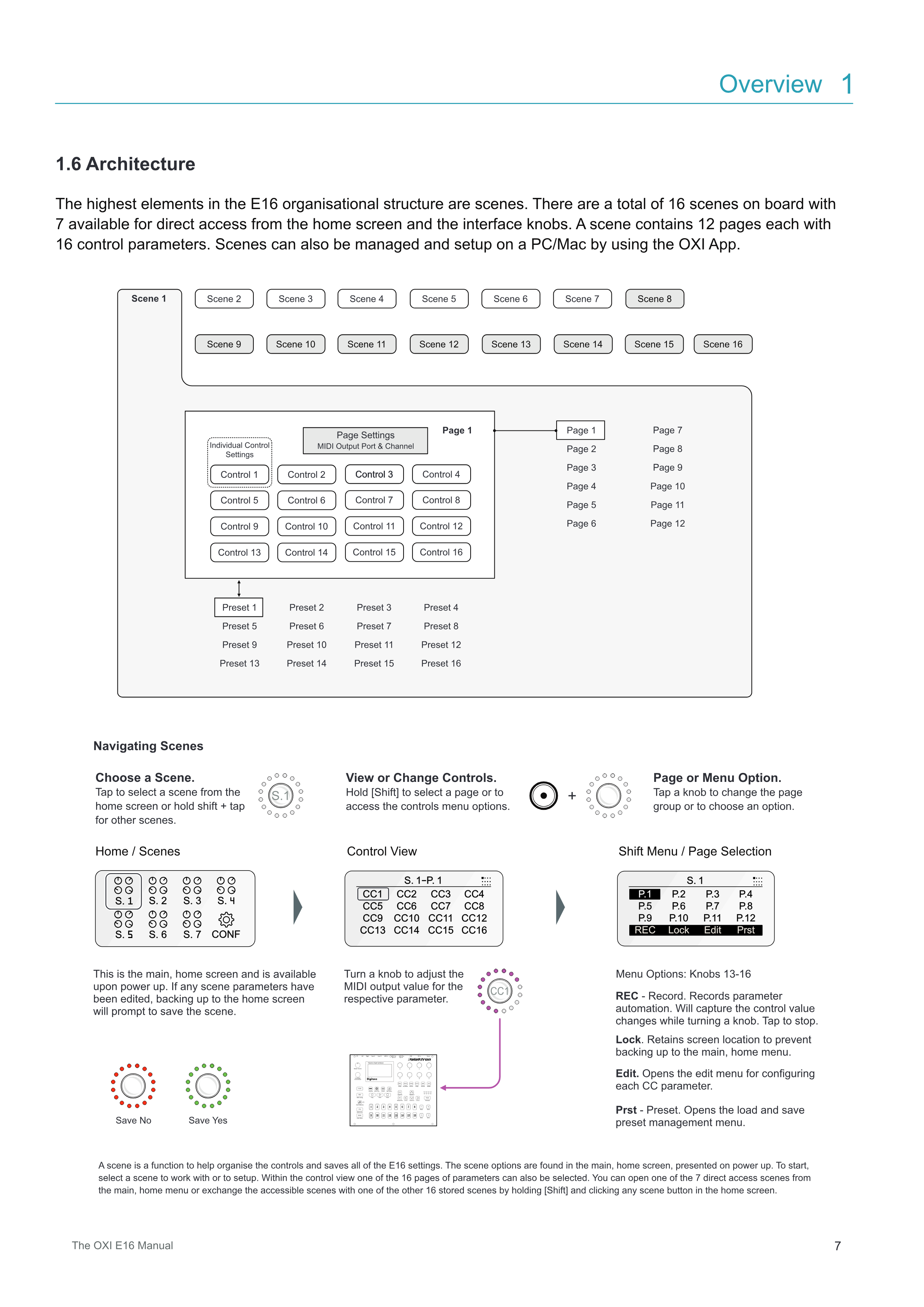 E16の組織構造における最上位の要素はシーンです。合計16個のシーンが搭載されており、ホーム画面とインターフェイスのノブから7個に直接アクセスできます。シーンには12個のページがあり、各ページには16個のコントロールパラメーターがあります。シーンはOXI Appを使用してPC/Macで管理およびセットアップすることもできます。