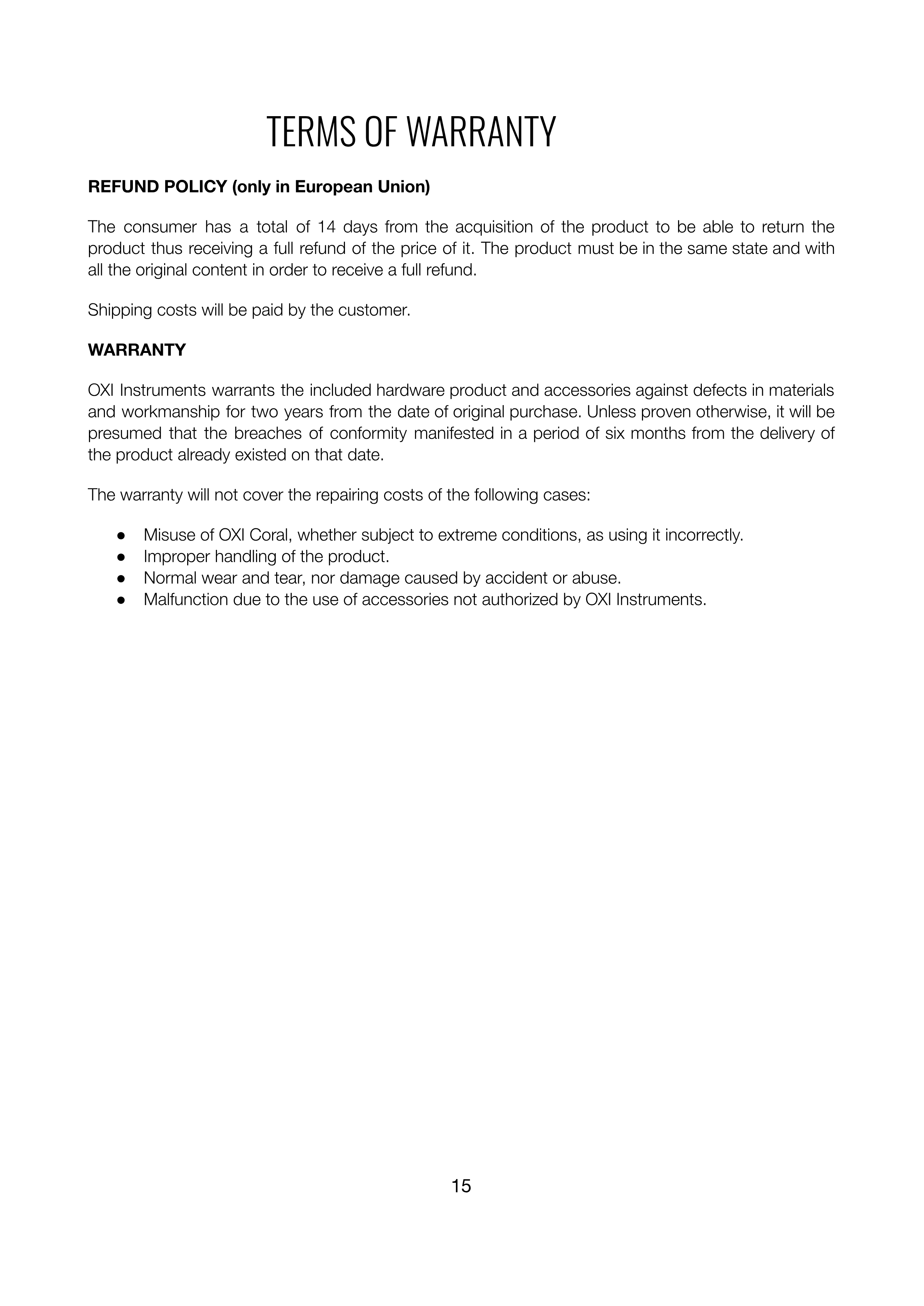 OXI Instrumentsは、同梱のハードウェア製品および付属品について、購入日から2年間、材料および製造上の欠陥に対して保証します。特段の証明がない限り、製品の引渡しから6ヶ月以内に生じた不適合は、引渡し時点で既に存在していたものと推定されます。
