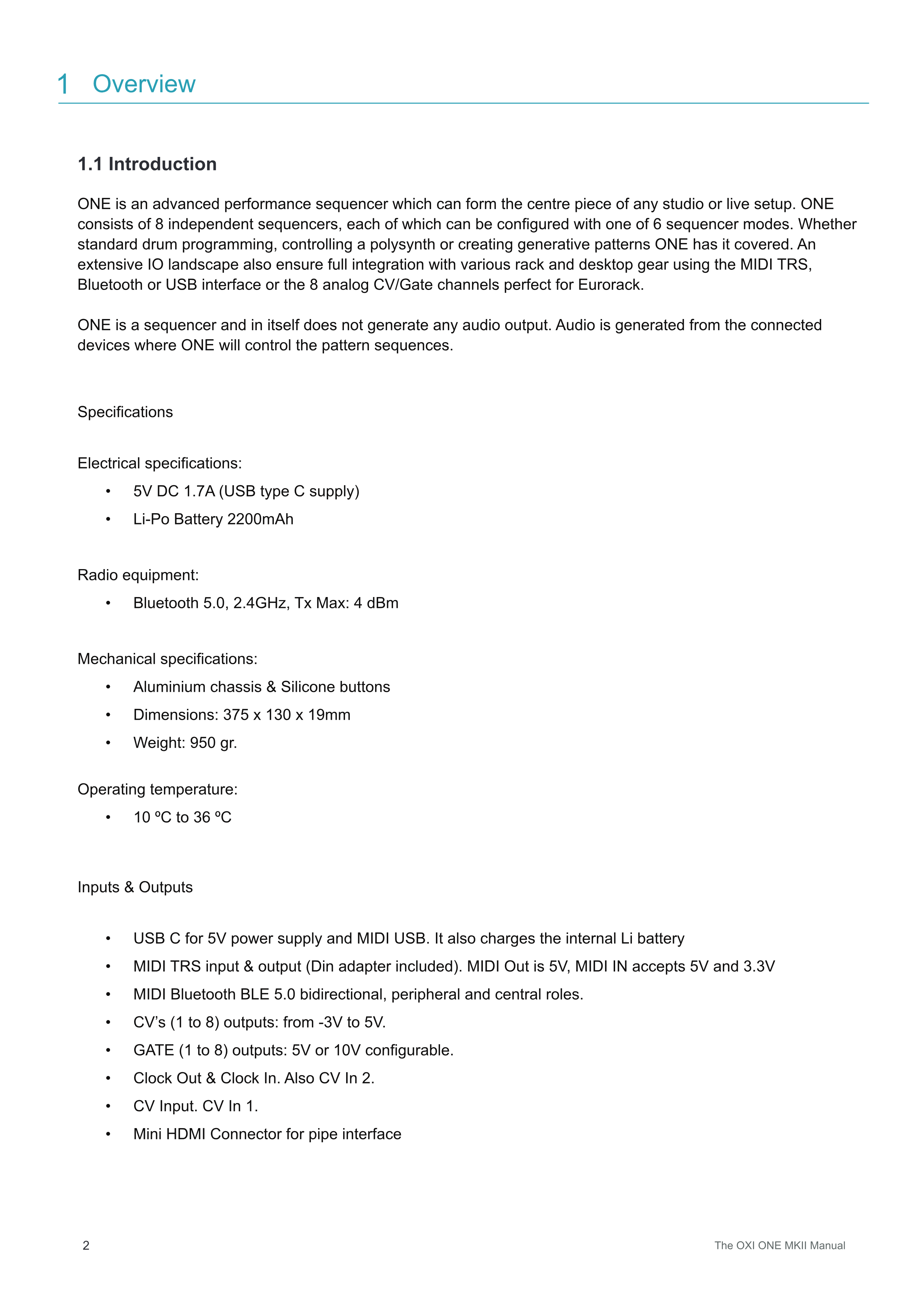 ONEはsequencerであり、それ自体はオーディオ出力を生成しません。オーディオは、ONEがパターンシーケンスを制御する接続されたデバイスから生成されます。