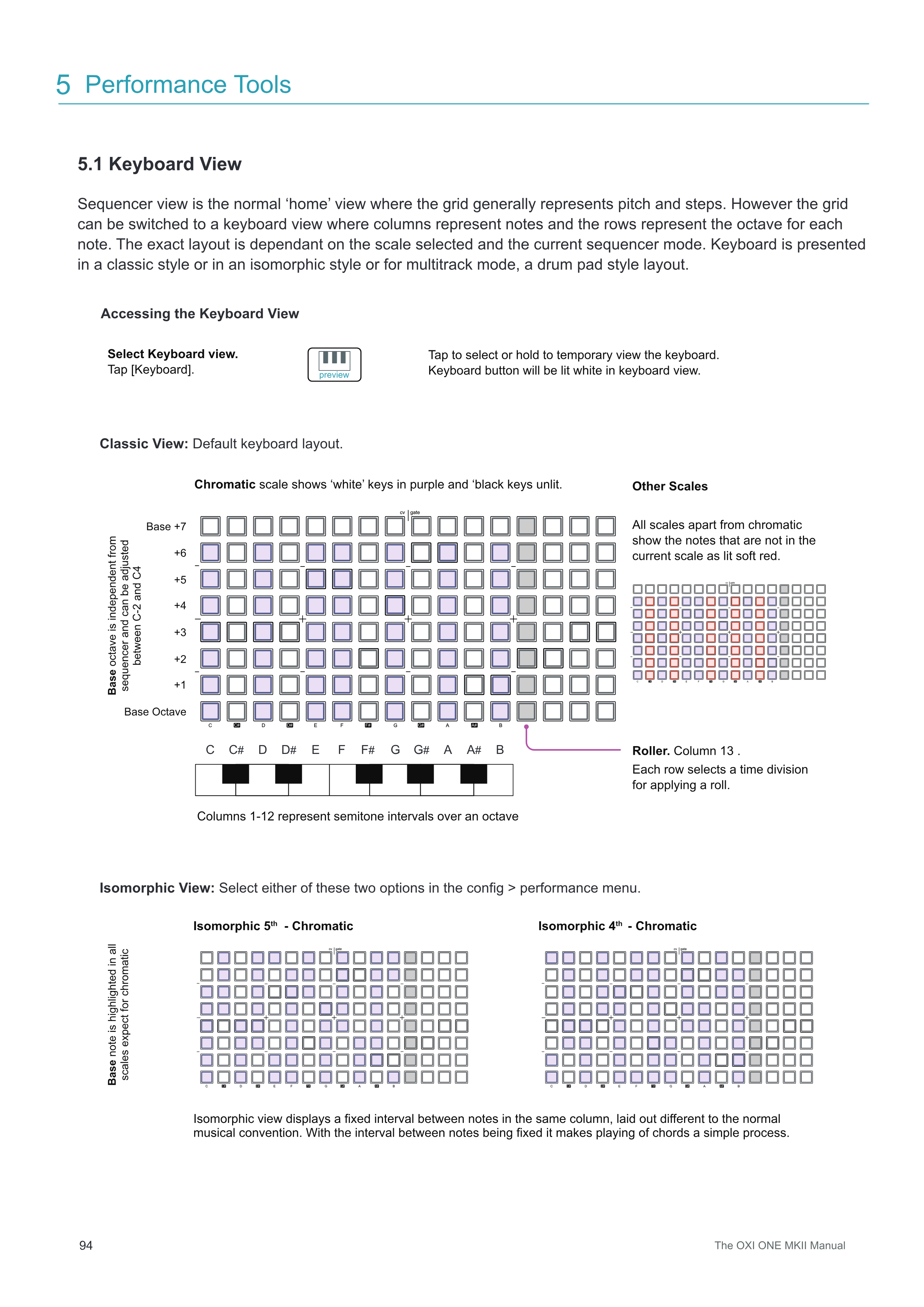 Sequencer viewは通常の「ホーム」ビューで、グリッドは一般的にピッチとステップを表します。しかし、グリッドはkeyboard viewに切り替えることができ、列は音符を表し、行は各音符のオクターブを表します。正確なレイアウトは、選択されたスケールと現在のsequencerモードに依存します。Keyboardは、クラシックスタイル、イソモーフィックスタイル、またはマルチトラックモード用のドラムパッドスタイルのレイアウトで表示されます。