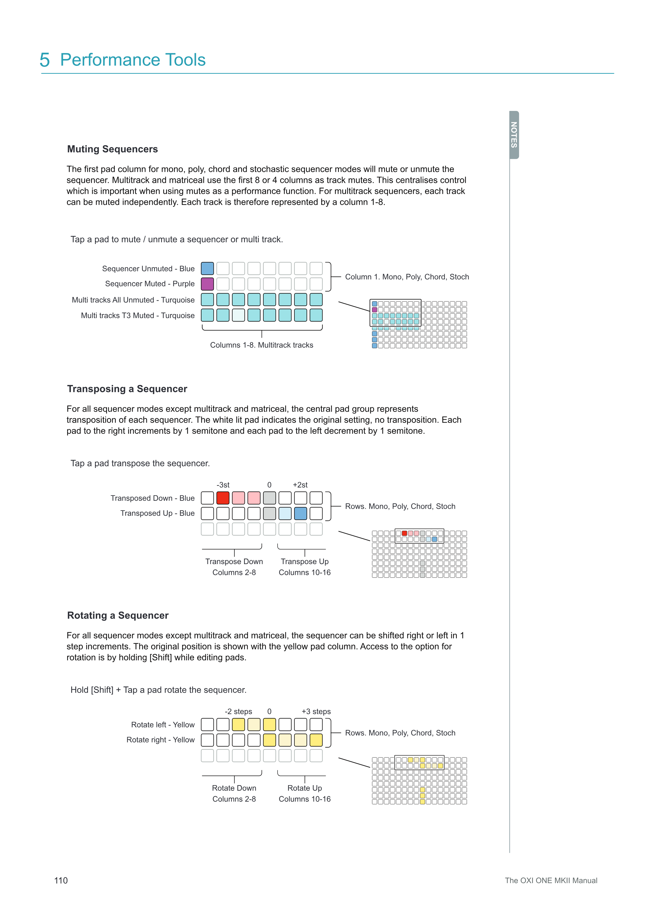 MultitrackとMatriceal以外のすべてのsequencerモードでは、中央のパッドグループが各sequencerのトランスポーズを表します。白く点灯したパッドは元の設定、つまりトランスポーズなしを示します。右側の各パッドは1半音ずつ上昇し、左側の各パッドは1半音ずつ下降します。