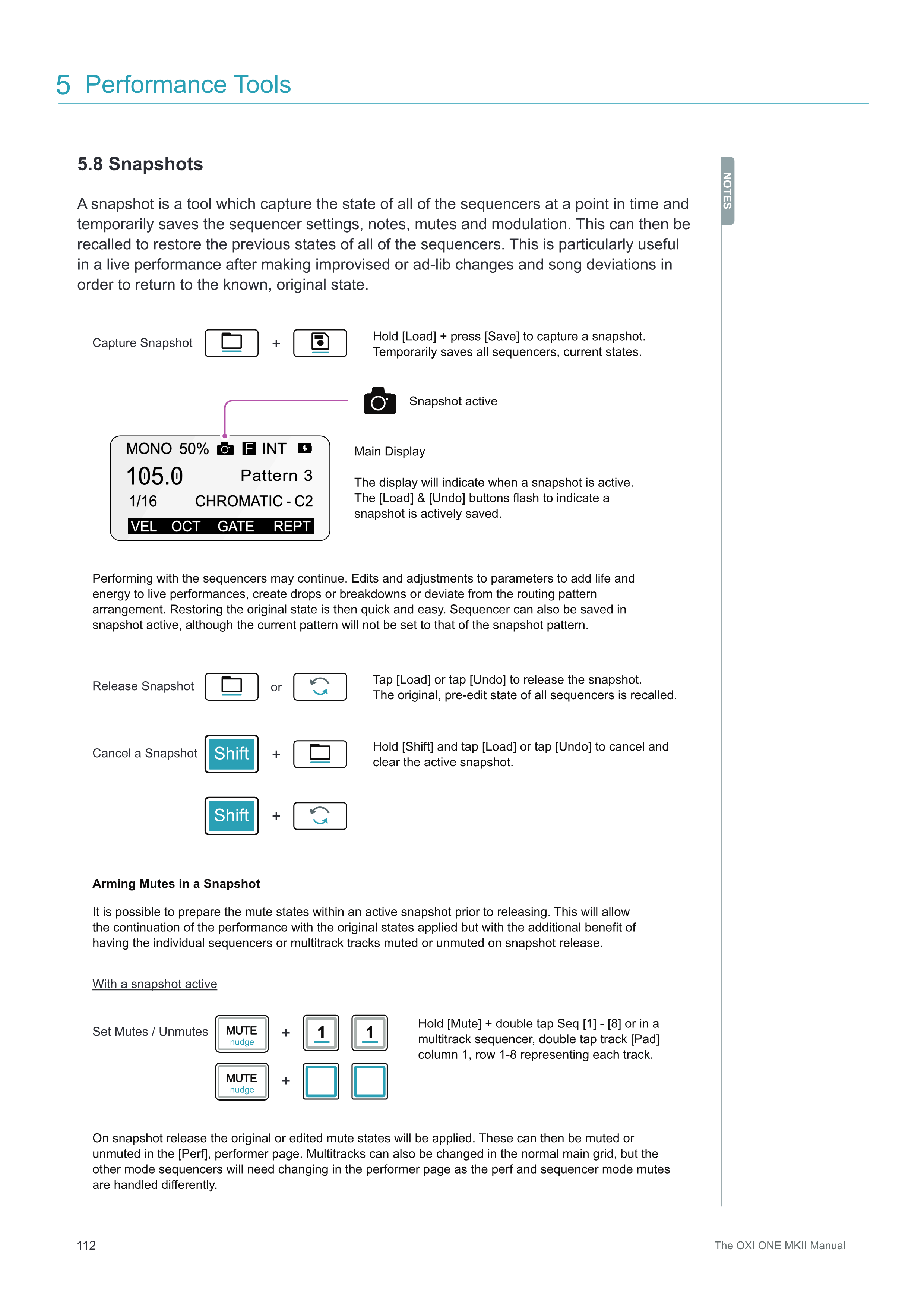 Snapshotは、ある時点でのすべてのsequencerの状態をキャプチャし、sequencerの設定、ノート、ミュート、モジュレーションを一時的に保存するツールです。これにより、すべてのsequencerの以前の状態を呼び出して復元することができます。これは特にライブパフォーマンスにおいて、即興やアドリブの変更、曲の展開を行った後、既知のオリジナルの状態に戻るために非常に便利です。