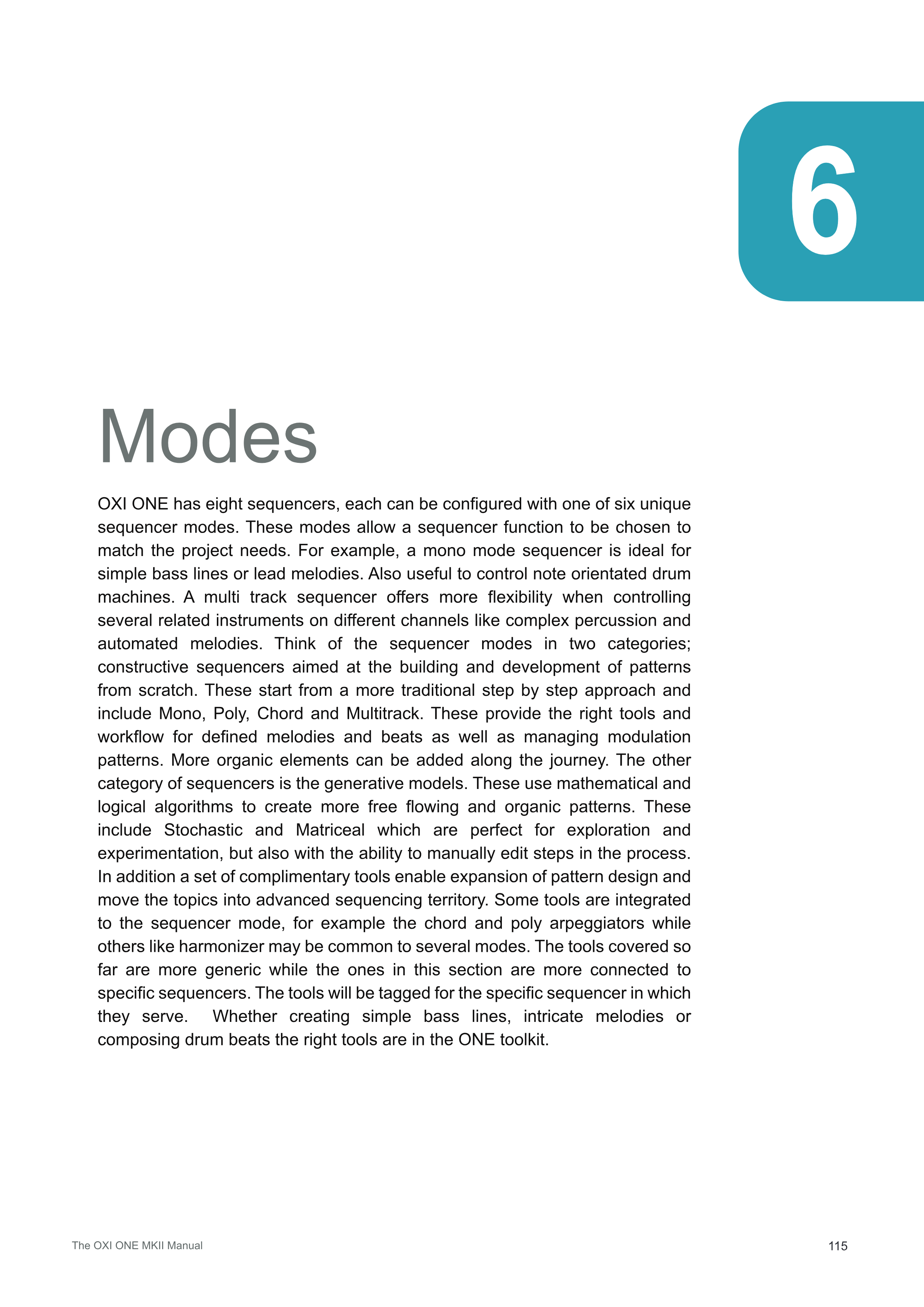 OXI ONEには8つのsequencerがあり、それぞれ6つのユニークなsequencerモードのいずれかで構成できます。これらのモードにより、プロジェクトのニーズに合わせてsequencer機能を選択できます。例えば、monoモードsequencerはシンプルなベースラインやリードメロディに最適です。また、音符指向のドラムマシンのコントロールにも便利です。multi tracksequencerは、複雑なパーカッションや自動化されたメロディなど、異なるチャンネル上の複数の関連楽器をコントロールする際により柔軟性を提供します。sequencerモードを2つのカテゴリで考えてみましょう。1つ目は、ゼロからパターンを構築・発展させることを目的とした構築的sequencerです。これらはより伝統的なステップバイステップのアプローチから始まり、Mono、Poly、Chord、Multitrackが含まれます。これらは、明確なメロディやビートを作成するための適切なツールとワークフローを提供し、モジュレーションパターンの管理も行います。より有機的な要素は制作過程で追加できます。もう1つのカテゴリは生成的モデルのsequencerです。これらは数学的・論理的アルゴリズムを使用して、より自由で有機的なパターンを作成します。StochasticとMatricealが含まれ、探索と実験に最適ですが、プロセス内でステップを手動編集する機能もあります。さらに、補完的なツールセットにより、パターンデザインの拡張が可能になり、高度なシーケンシング領域へとトピックを進めます。一部のツールはsequencerモードに統合されています。例えば、chordとpolyのarpeggiatorなどです。一方、harmonizerのような他のツールは複数のモードに共通している場合があります。これまでに説明したツールはより汎用的ですが、このセクションのツールは特定のsequencerにより密接に関連しています。ツールには、それらが機能する特定のsequencerのタグが付けられます。シンプルなベースライン、複雑なメロディ、ドラムビートの作曲のいずれであっても、適切なツールがONEツールキットに揃っています。