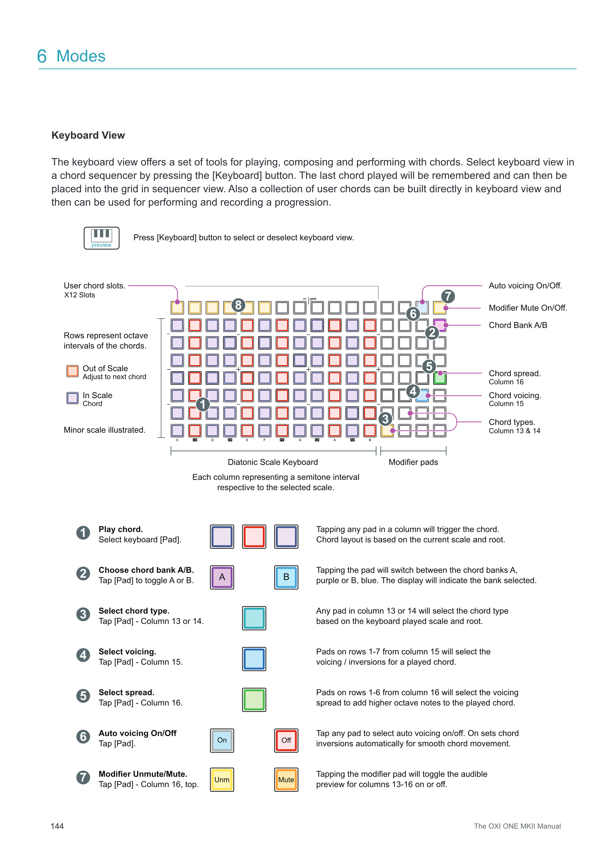 Chord types. Chord spread. Column 16 Column 13 & 14 Column 15 Chord voicing. Chord Bank A/B Modifier Mute On/Off. Auto voicing On/Off. User chord slots. Modes 6