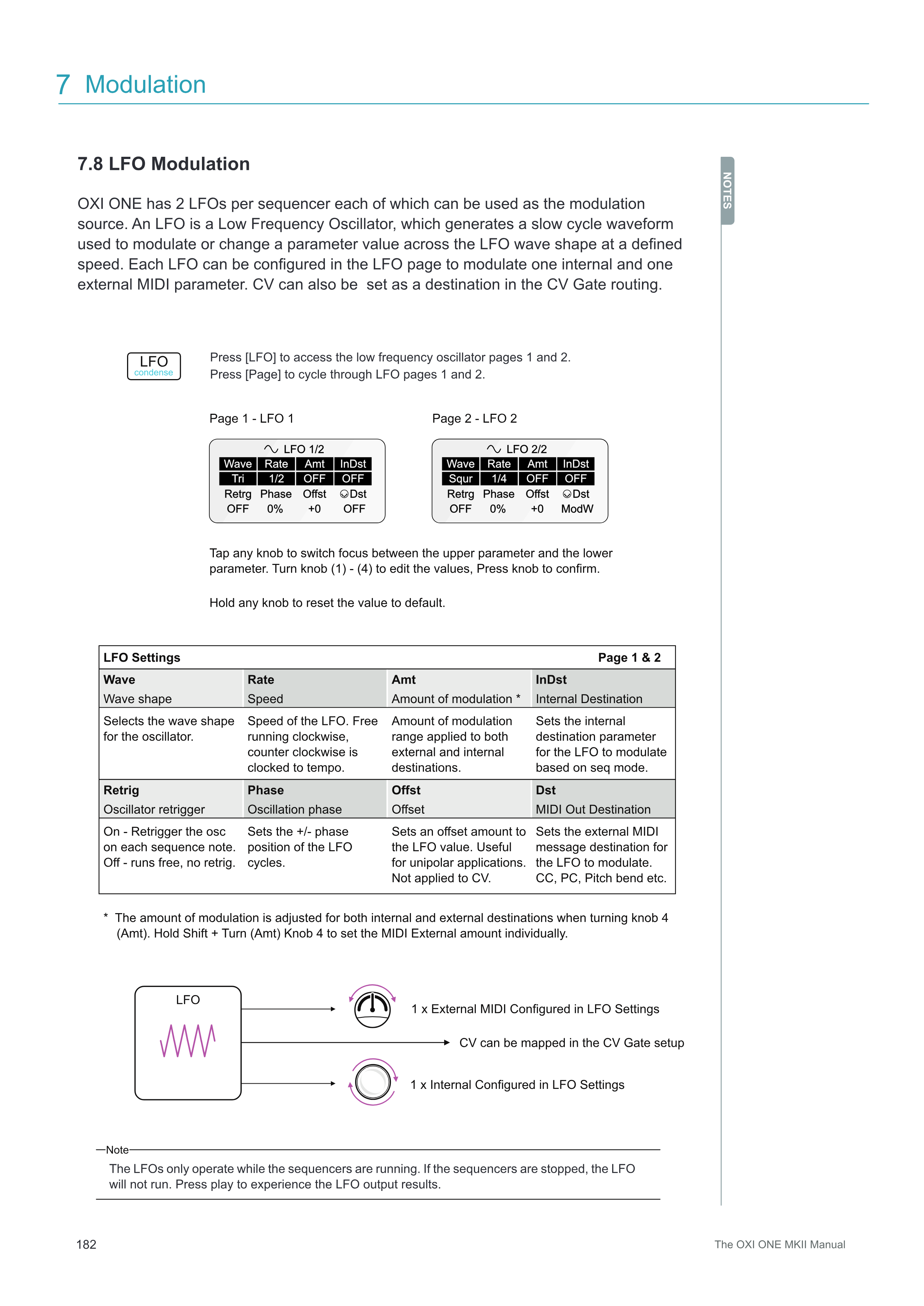 OXI ONEは各sequencerに2つのLFOを搭載しており、それぞれをmodulationソースとして使用できます。LFOはLow Frequency Oscillatorの略で、定義された速度でLFO波形に沿ってパラメータ値を変調または変更するために使用される、ゆっくりとした周期の波形を生成します。各LFOはLFOページで設定でき、1つの内部パラメータと1つの外部MIDIパラメータをmodulateできます。CVもCV Gateルーティングで送信先として設定できます。
