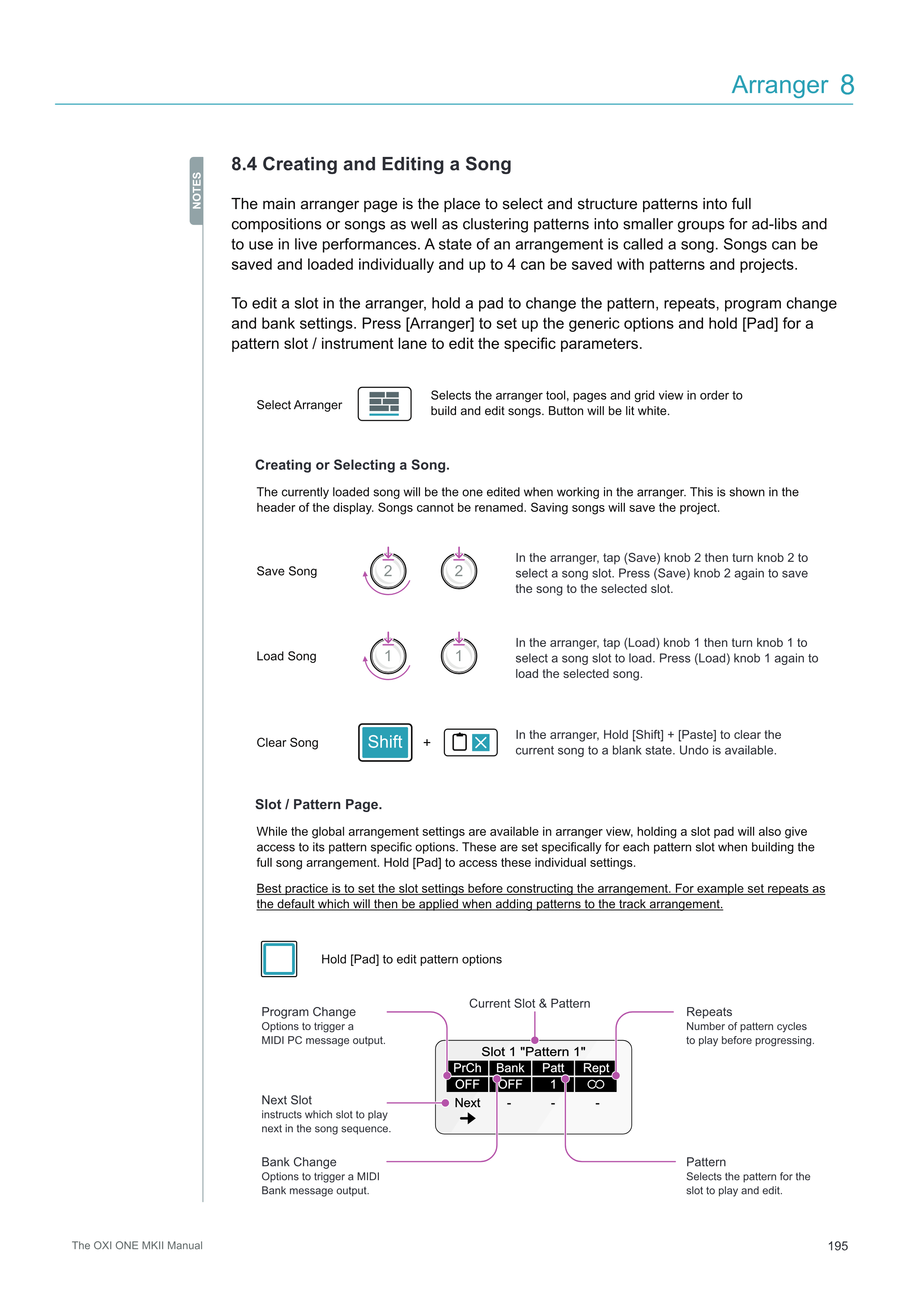 グローバルなアレンジメント設定はarrangerビューで利用できますが、スロットpadを押し続けることで、そのパターン固有のオプションにもアクセスできます。これらは、完全な楽曲アレンジメントを構築する際に、各パターンスロット専用に設定されます。これらの個別設定にアクセスするには[Pad]を押し続けます。