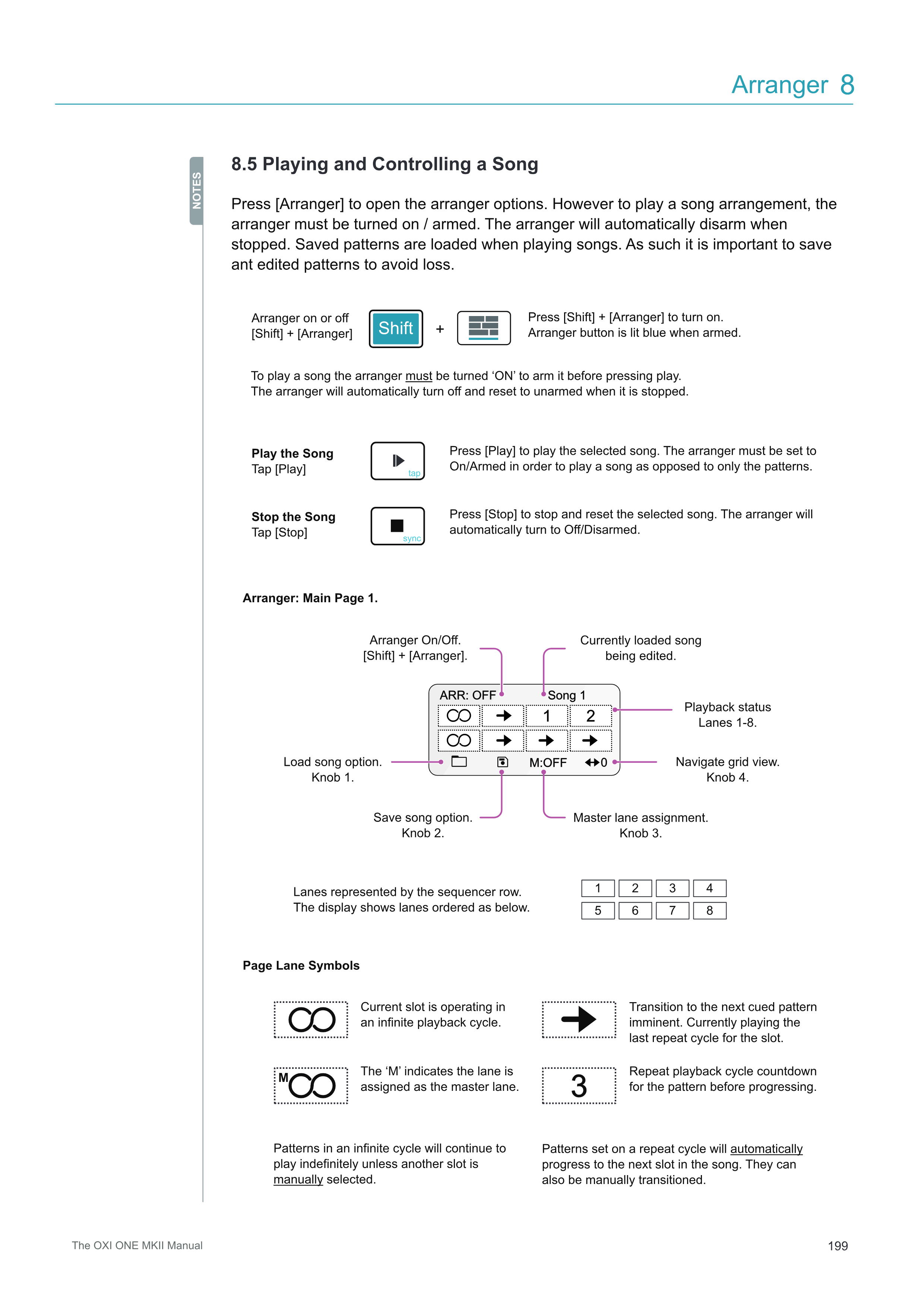 ソングを再生するには、再生を押す前にarrangerを'ON'にしてアームする必要があります。 arrangerは停止すると自動的にオフになり、アーム解除状態にリセットされます。