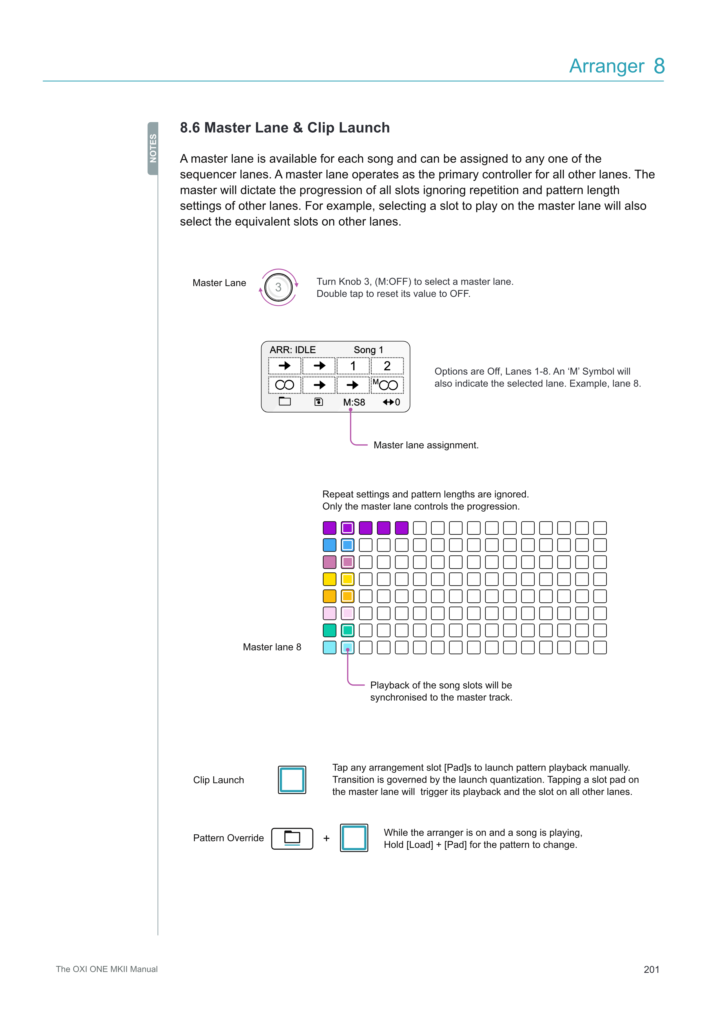 Master Lane Turn Knob 3 (M:OFF) を回してmaster laneを選択します。 ダブルタップすると値がOFFにリセットされます。 オプションはOff、Lanes 1-8です。「M」シンボルも 選択されたlaneを示します。例:lane 8。