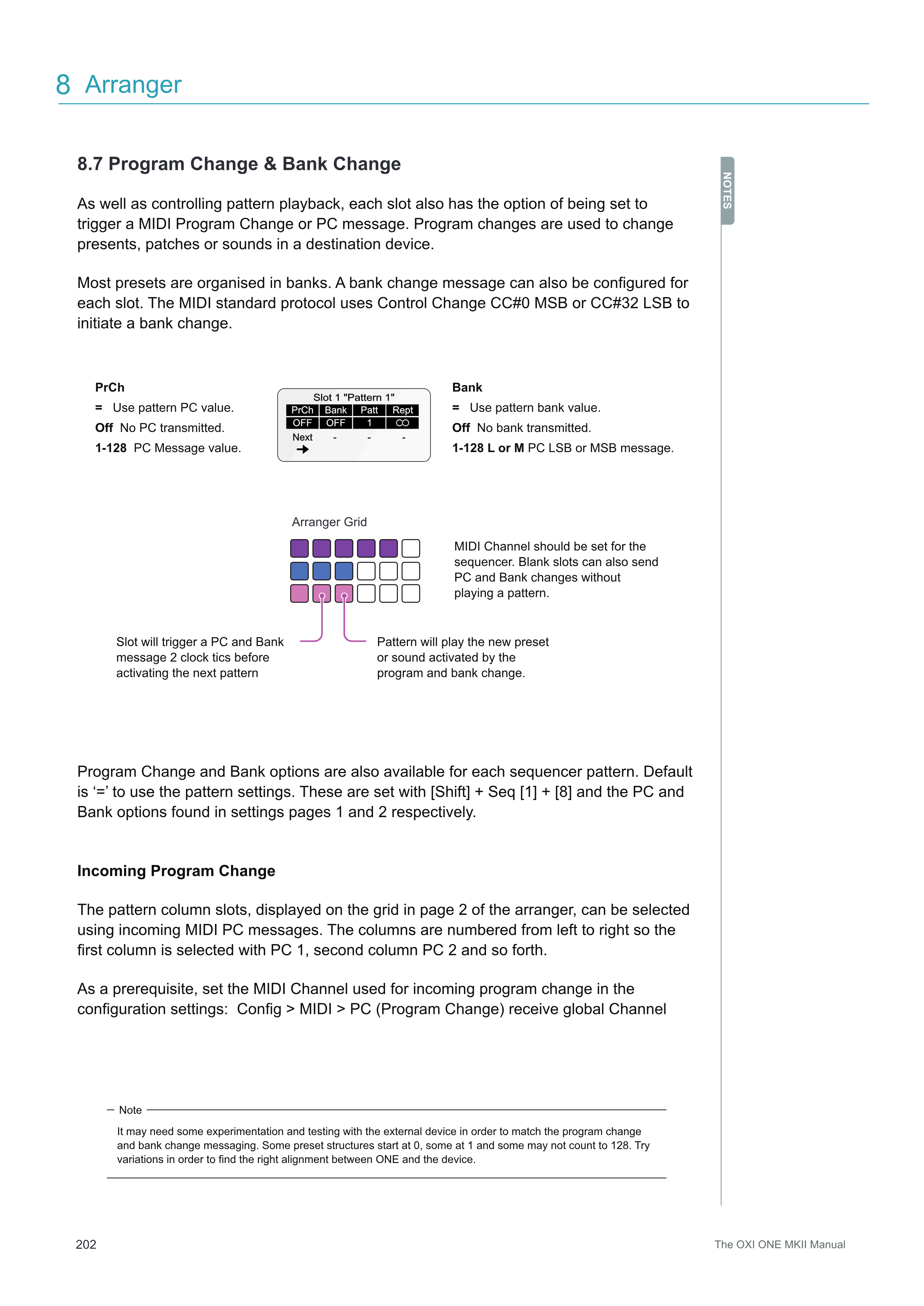 Program ChangeとBank Changeメッセージを外部デバイスと一致させるには、実験とテストが必要な場合があります。一部のプリセット構造は0から始まり、一部は1から始まり、一部は128までカウントしない場合があります。ONEとデバイス間の適切な整合性を見つけるために、バリエーションを試してください。