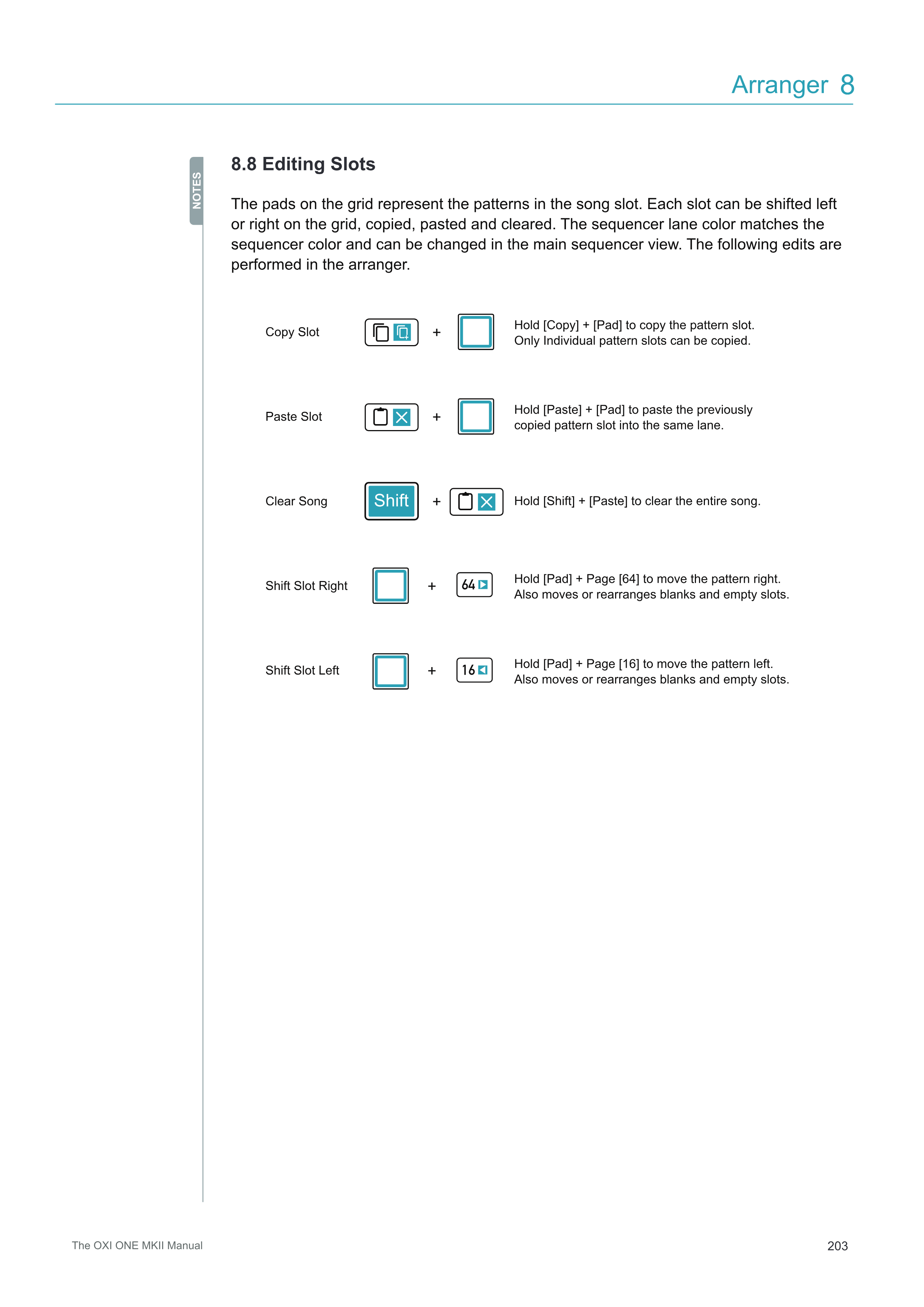 Shift Slot Left [Pad] + Page [16]を押しながら、パターンを左に移動します。 空白や空のスロットも移動または再配置されます。