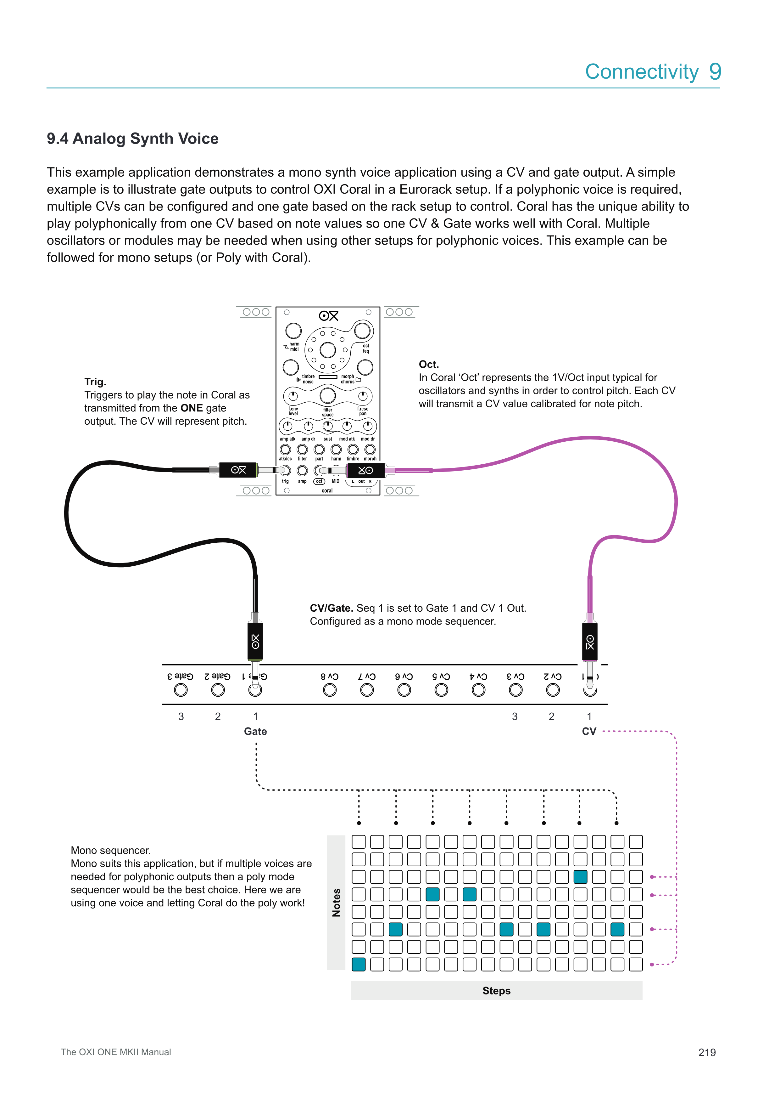 このアプリケーション例は、CVとgate出力を使用したモノシンセボイスアプリケーションを実演します。簡単な例として、EurorackセットアップでOXI Coralを制御するためのgate出力を説明します。ポリフォニックボイスが必要な場合は、複数のCVを設定し、ラックセットアップに基づいて1つのgateで制御できます。Coralは、ノート値に基づいて1つのCVからポリフォニックに演奏できるユニークな機能を持っているため、1つのCV & GateでCoralとうまく機能します。他のセットアップでポリフォニックボイスを使用する場合は、複数のオシレーターまたはモジュールが必要になることがあります。この例は、モノセットアップ(またはCoralとのPoly)に従うことができます。