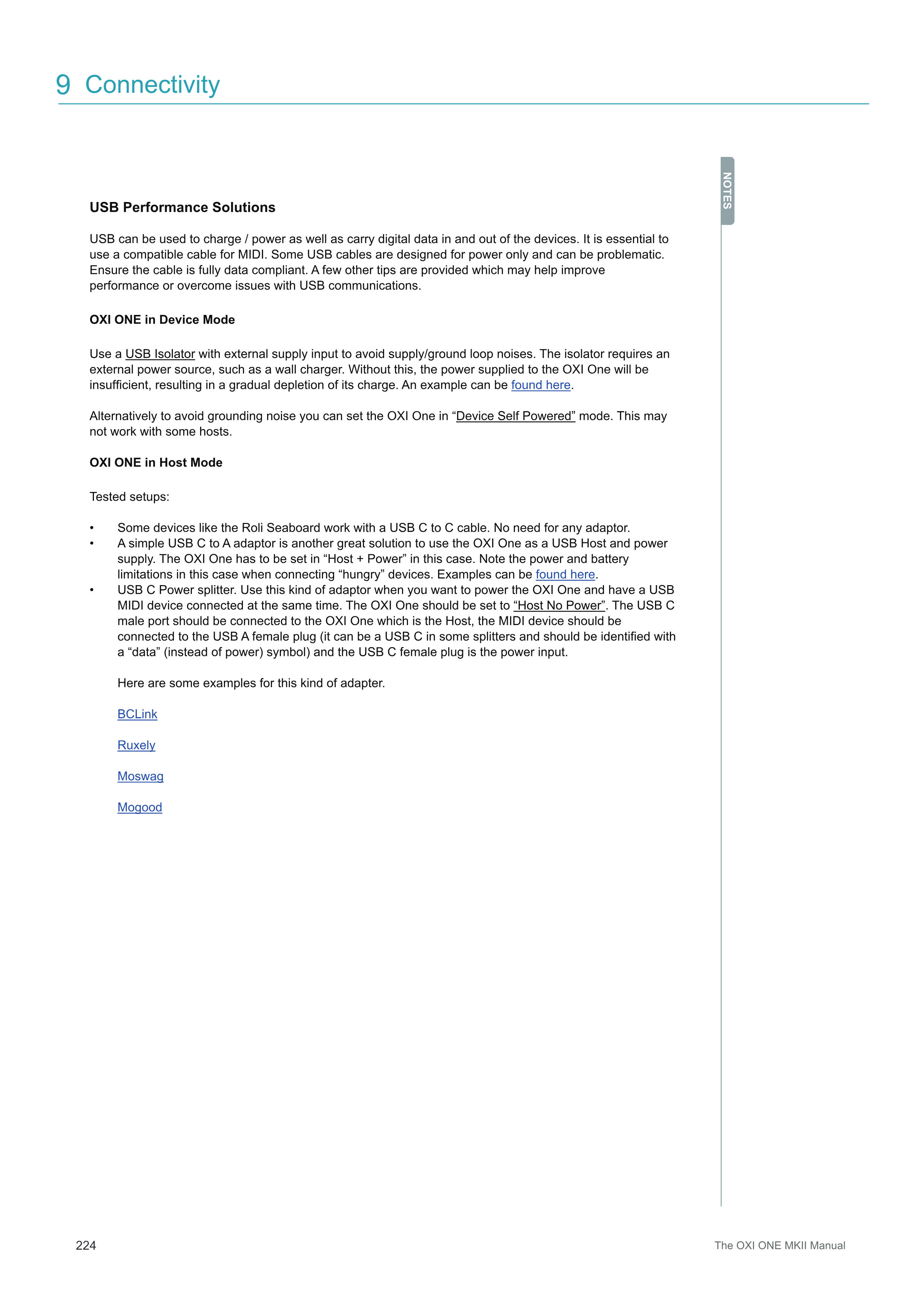 外部電源入力付きのUSBアイソレーターを使用して、電源やグラウンドループノイズを回避してください。アイソレーターには、壁のコンセントなどの外部電源が必要です。これを使用しない場合、OXI Oneに供給される電力が不足し、充電が徐々に減少します。例えばこちらで見つけることができます。