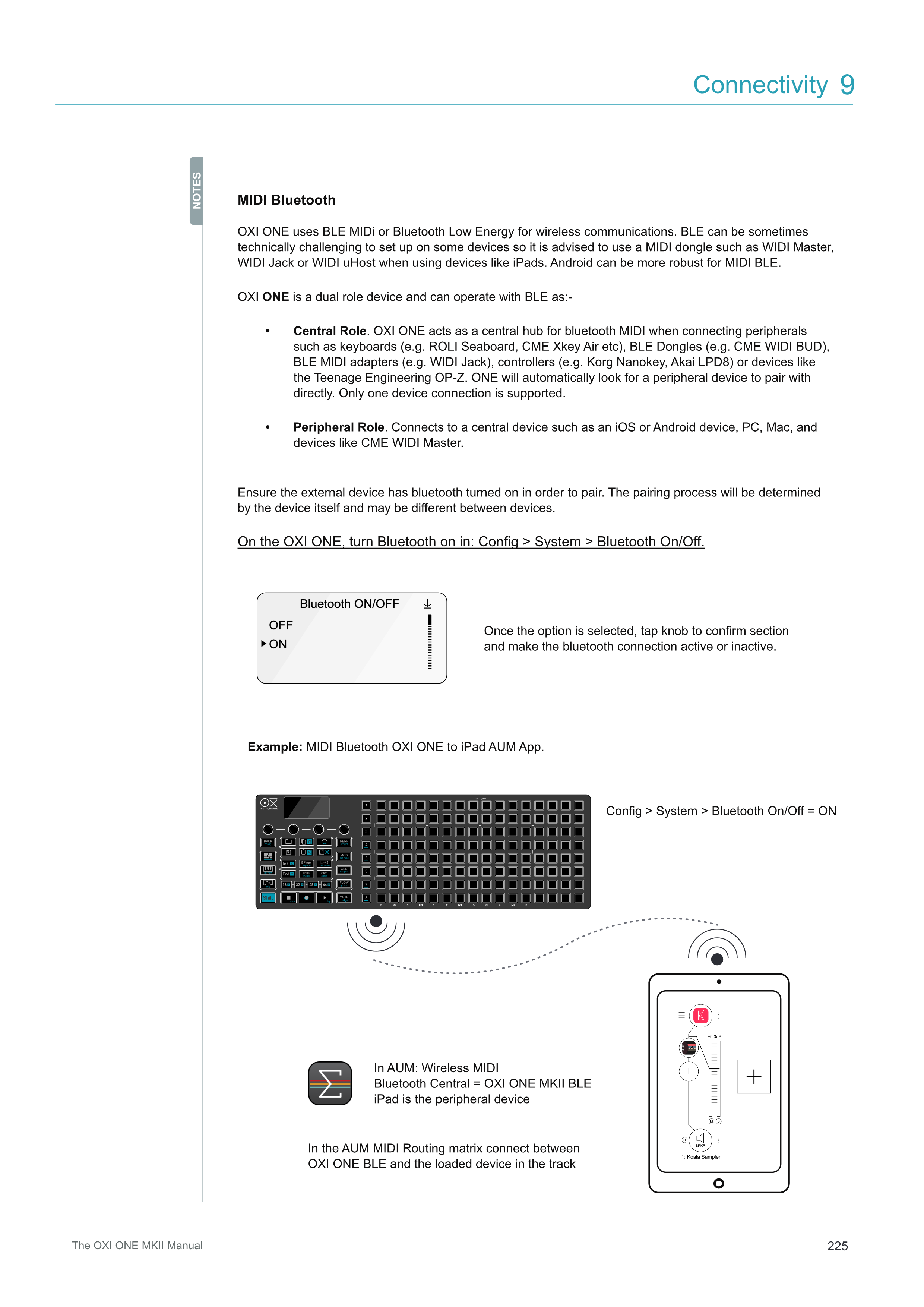 • Central Role. OXI ONEは、キーボード(例: ROLI Seaboard、CME Xkey Airなど)、BLEドングル(例: CME WIDI BUD)、BLE MIDIアダプター(例: WIDI Jack)、コントローラー(例: Korg Nanokey、Akai LPD8)、またはTeenage Engineering OP-Zのようなデバイスなどのペリフェラルを接続する際に、Bluetooth MIDIのセントラルハブとして機能します。ONEは自動的にペリフェラルデバイスを検索して直接ペアリングします。サポートされるデバイス接続は1つのみです。