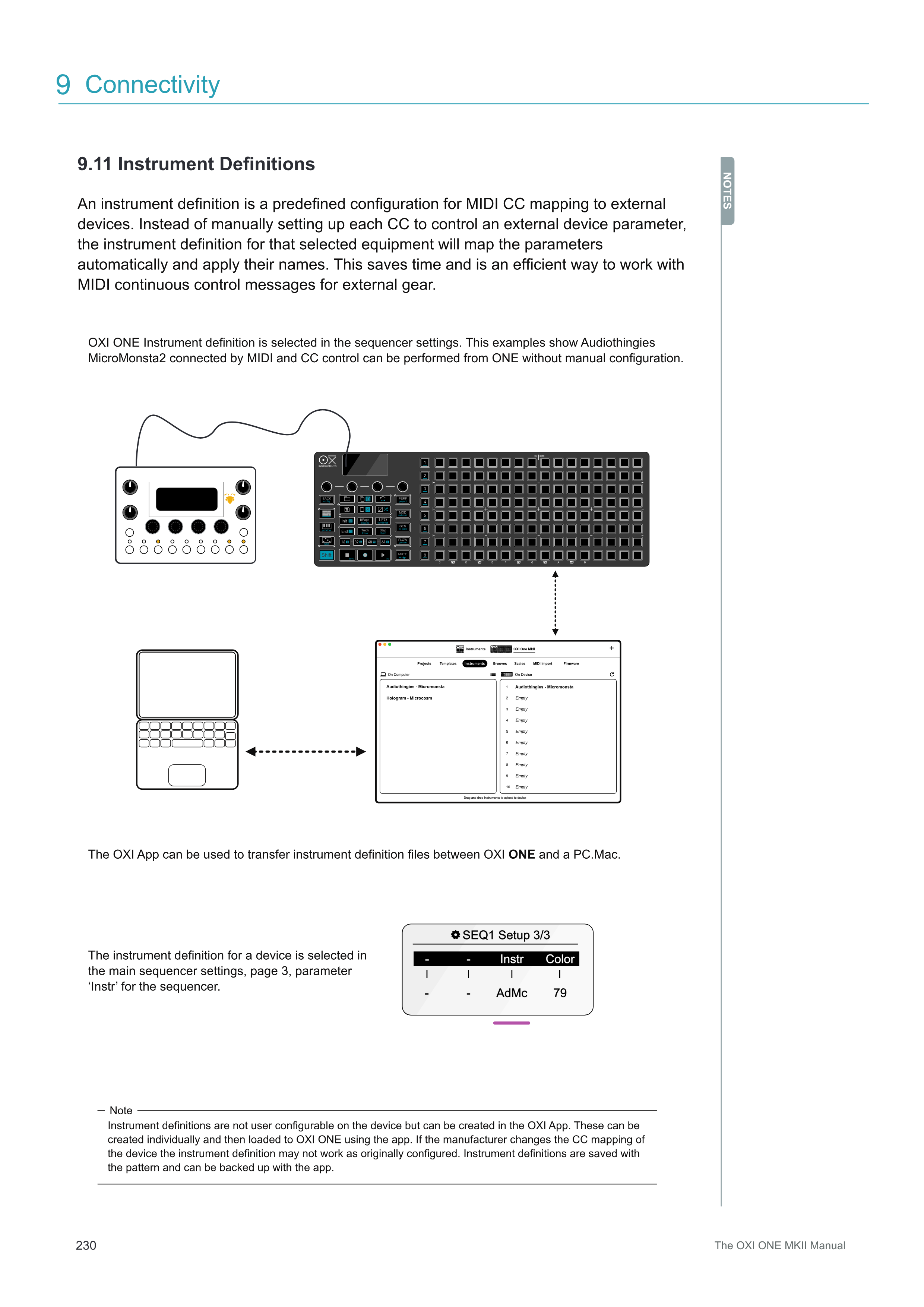 Instrument definitionsはデバイス上でユーザーが設定することはできませんが、OXI Appで作成できます。個別に作成してから、Appを使用してOXI ONEにロードできます。メーカーがデバイスのCCマッピングを変更した場合、instrument definitionは元の設定通りに動作しない可能性があります。Instrument definitionsはパターンと共に保存され、Appでバックアップできます。