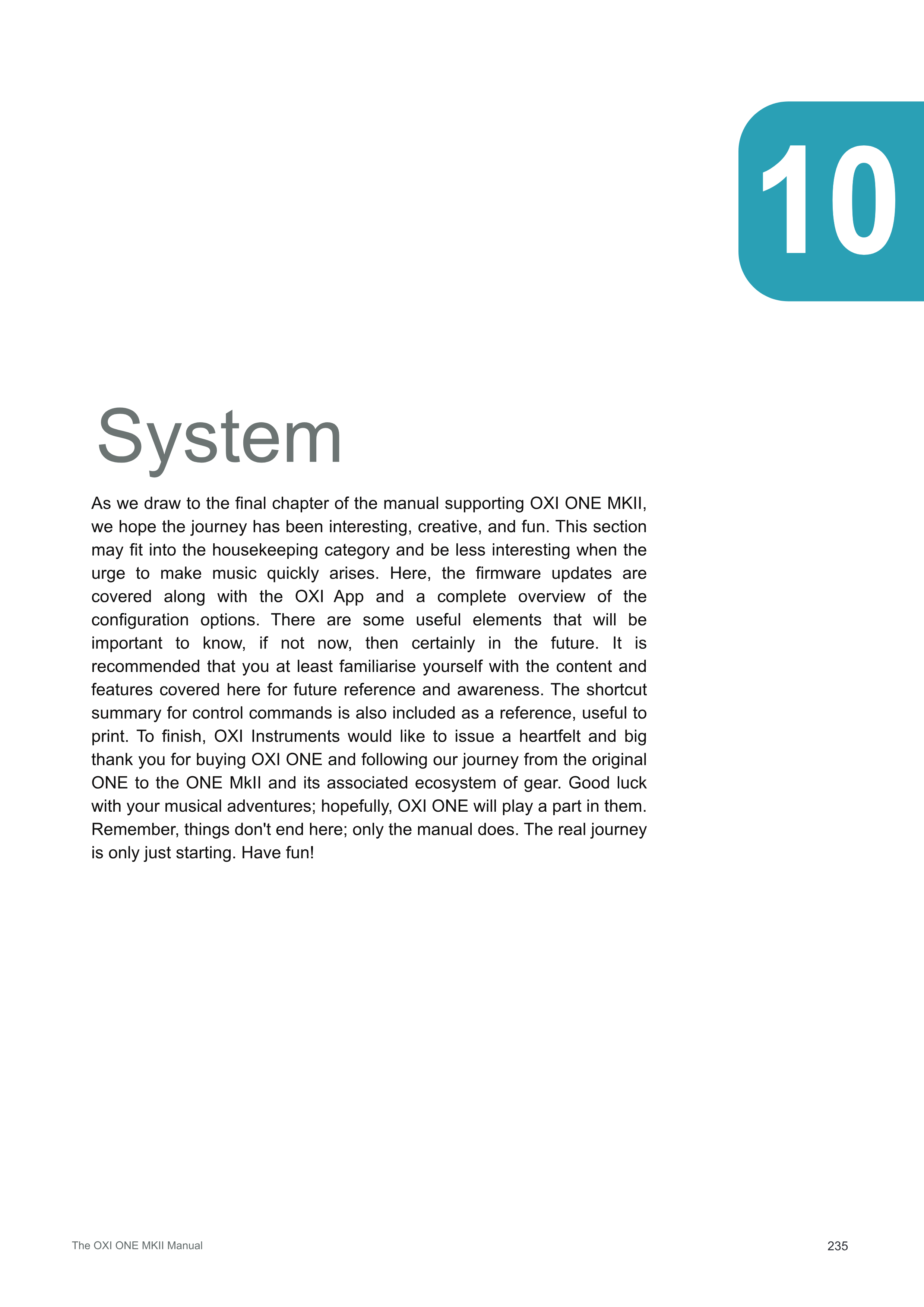 OXI ONE MKIIをサポートするマニュアルの最終章に近づくにあたり、この旅が興味深く、創造的で、そして楽しいものであったことを願っています。このセクションは、すぐに音楽を作りたいという衝動が湧き起こった時には、管理的な範疇に入り、あまり面白くないかもしれません。ここでは、firmwareのアップデート、OXI App、そして設定オプションの完全な概要について説明します。今すぐではなくとも、将来的には知っておくことが重要となる便利な要素がいくつかあります。少なくとも、将来の参照と認識のために、ここで取り上げられている内容と機能に目を通しておくことをお勧めします。コントロールコマンドのショートカット一覧も参考資料として含まれており、印刷すると便利です。最後に、OXI Instrumentsは、OXI ONEをご購入いただき、オリジナルのONEからONE MKIIとその関連エコシステムへの私たちの旅に同行していただいたことに、心からの大きな感謝の意を表したいと思います。あなたの音楽的冒険に幸運を。OXI ONEがその一部となることを願っています。覚えておいてください、ここで終わりではありません。終わるのはマニュアルだけです。本当の旅は始まったばかりです。楽しんでください!