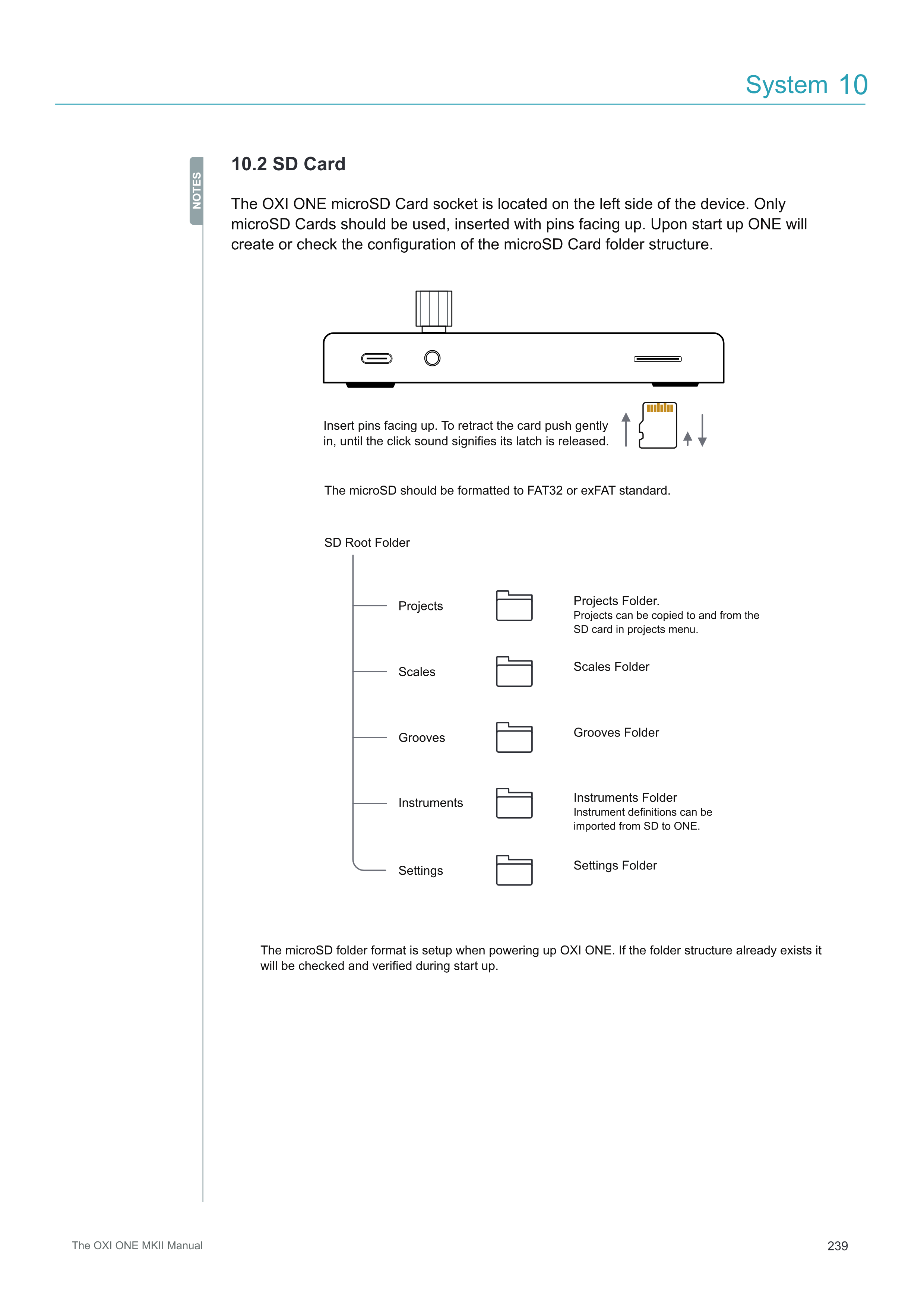 OXI ONE microSDカードスロットは、デバイスの左側に配置されています。microSDカードのみを使用し、ピンを上向きにして挿入してください。起動時にONEはmicroSDカードのフォルダ構造を作成または確認します。