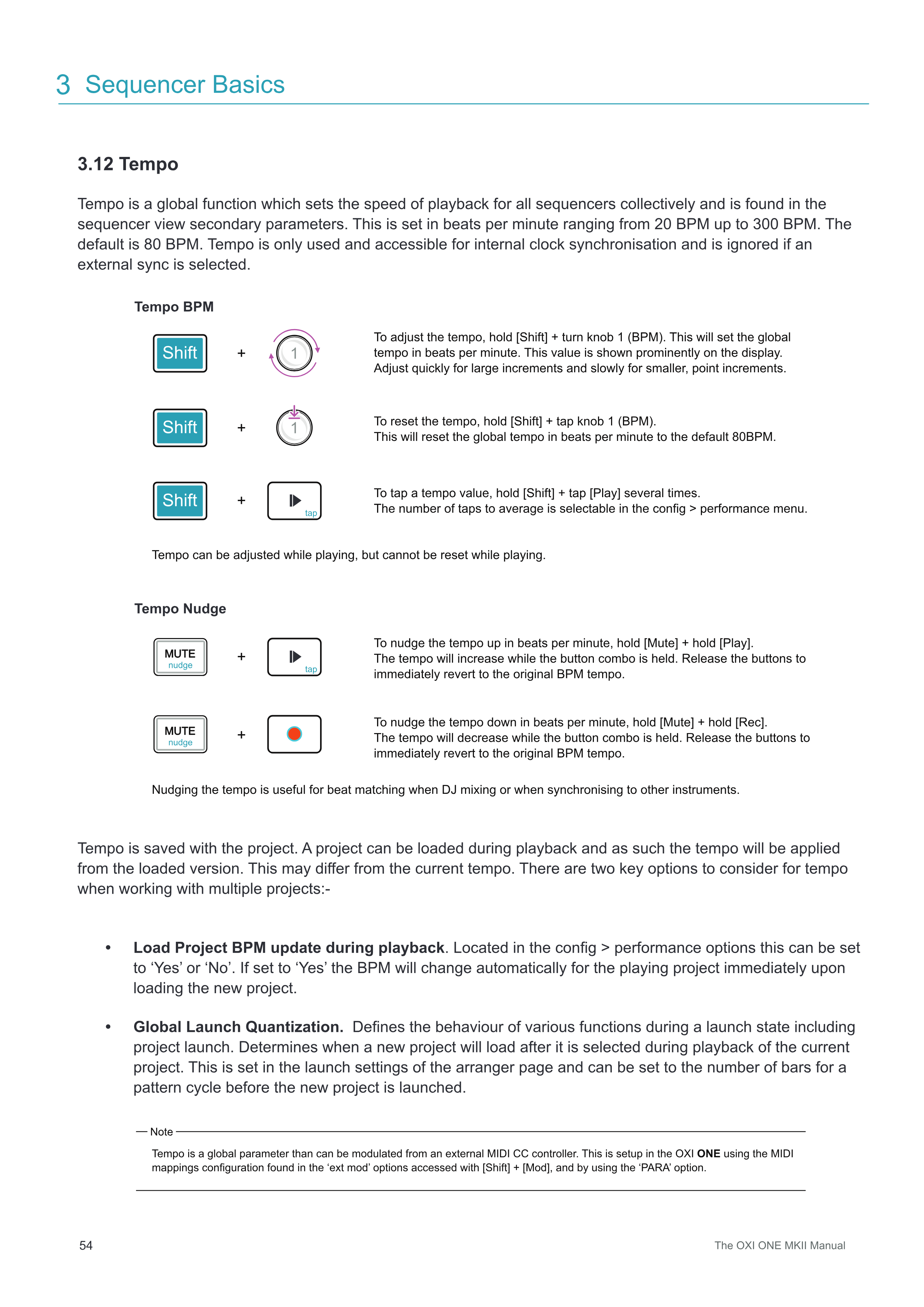 Tempoは全てのsequencerの再生速度を一括して設定するグローバル機能で、sequencerビューのセカンダリパラメータ内にあります。これは20 BPMから300 BPMの範囲でbeats per minuteで設定されます。デフォルトは80 BPMです。Tempoは内部クロック同期の場合にのみ使用およびアクセス可能で、外部同期が選択されている場合は無視されます。