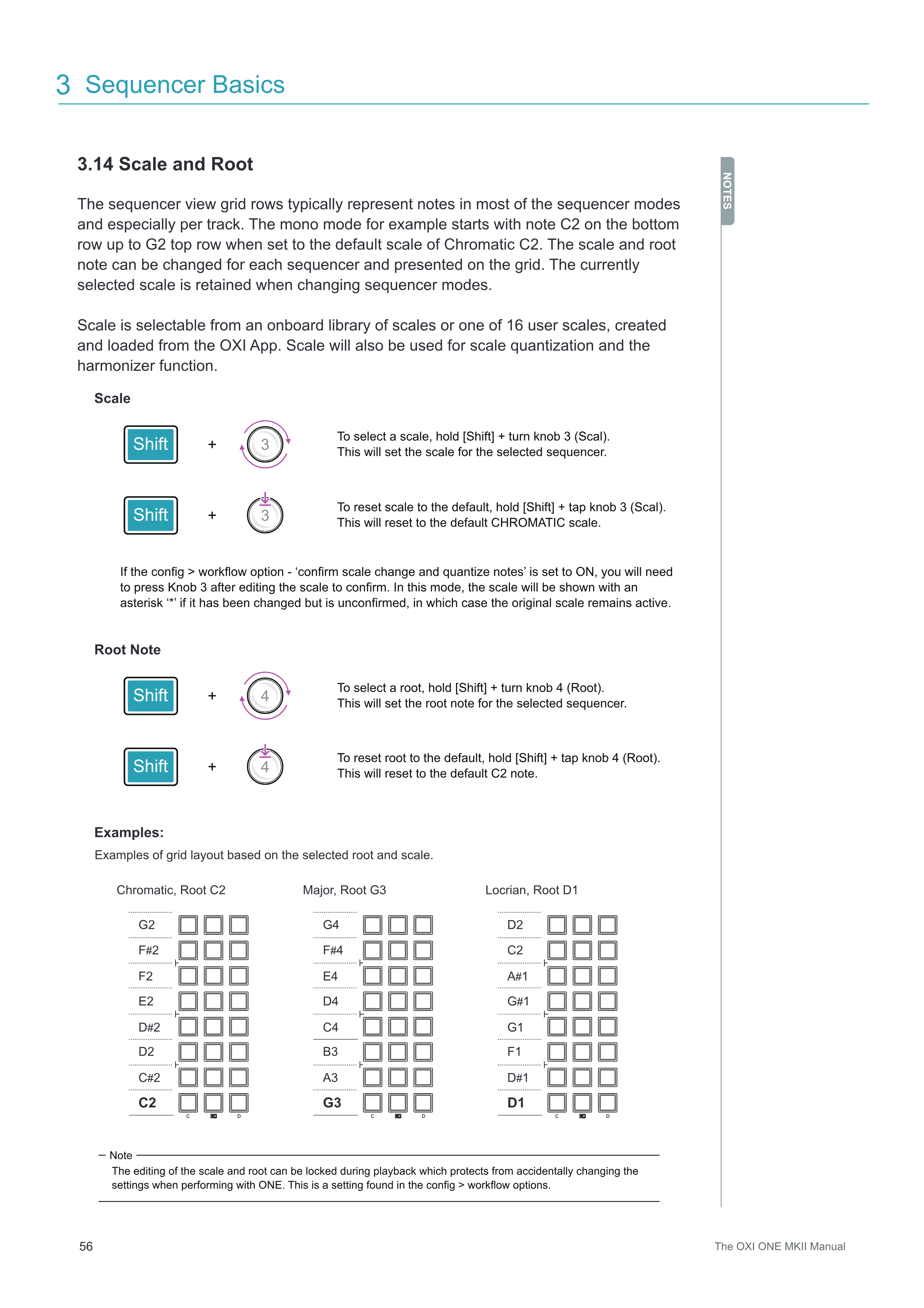scaleとrootの編集は、再生中にロックすることができます。これにより、ONEでパフォーマンスを行う際に誤って設定を変更してしまうことを防ぎます。この設定はconfig > workflowオプションにあります。