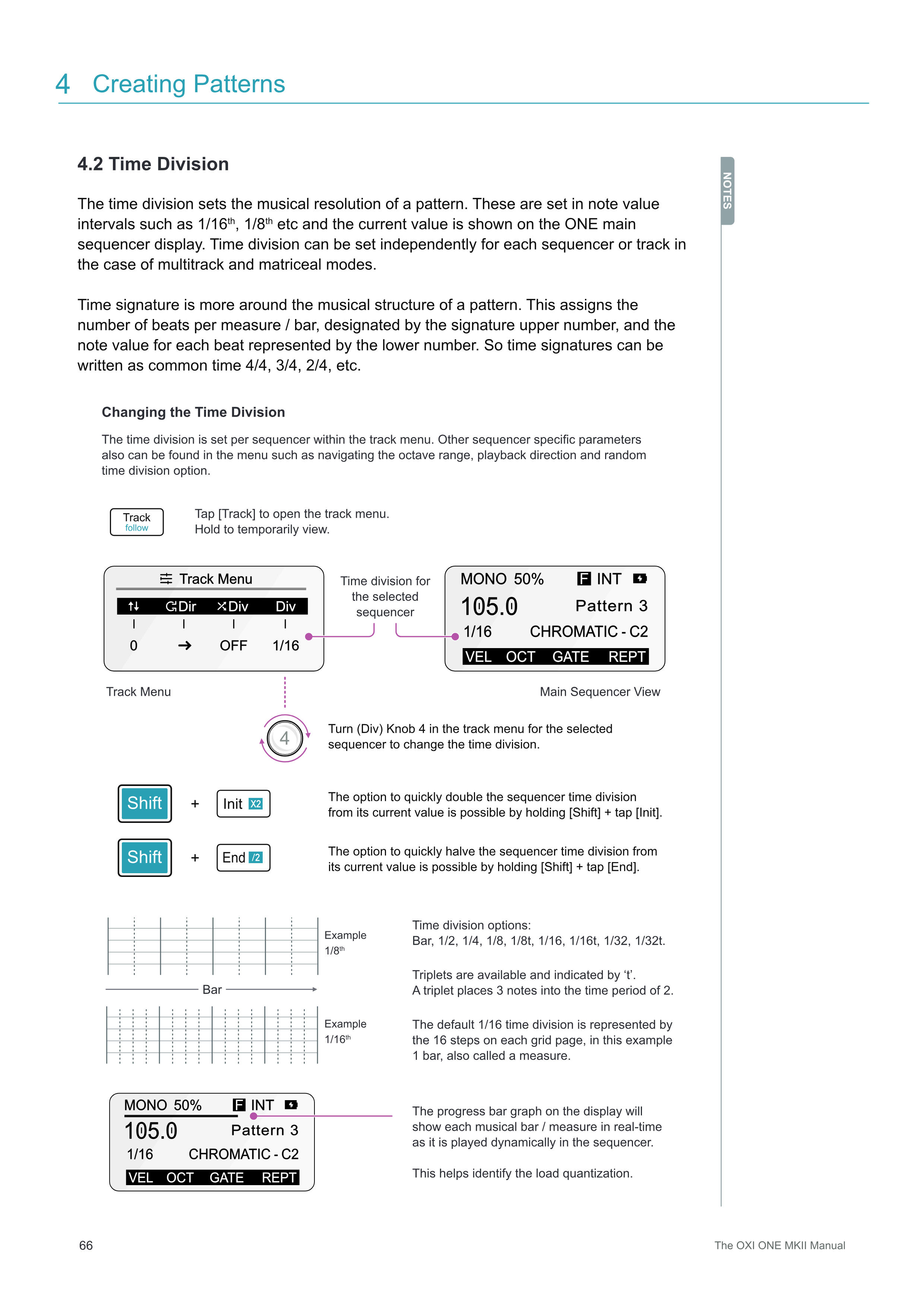 Time divisionはパターンの音楽的な解像度を設定します。これは1/16、1/8などの音価で設定され、現在の値はONEのメインsequencer表示に表示されます。Time divisionは、multitrackモードとmatricealモードの場合、各sequencerまたはトラックごとに独立して設定できます。