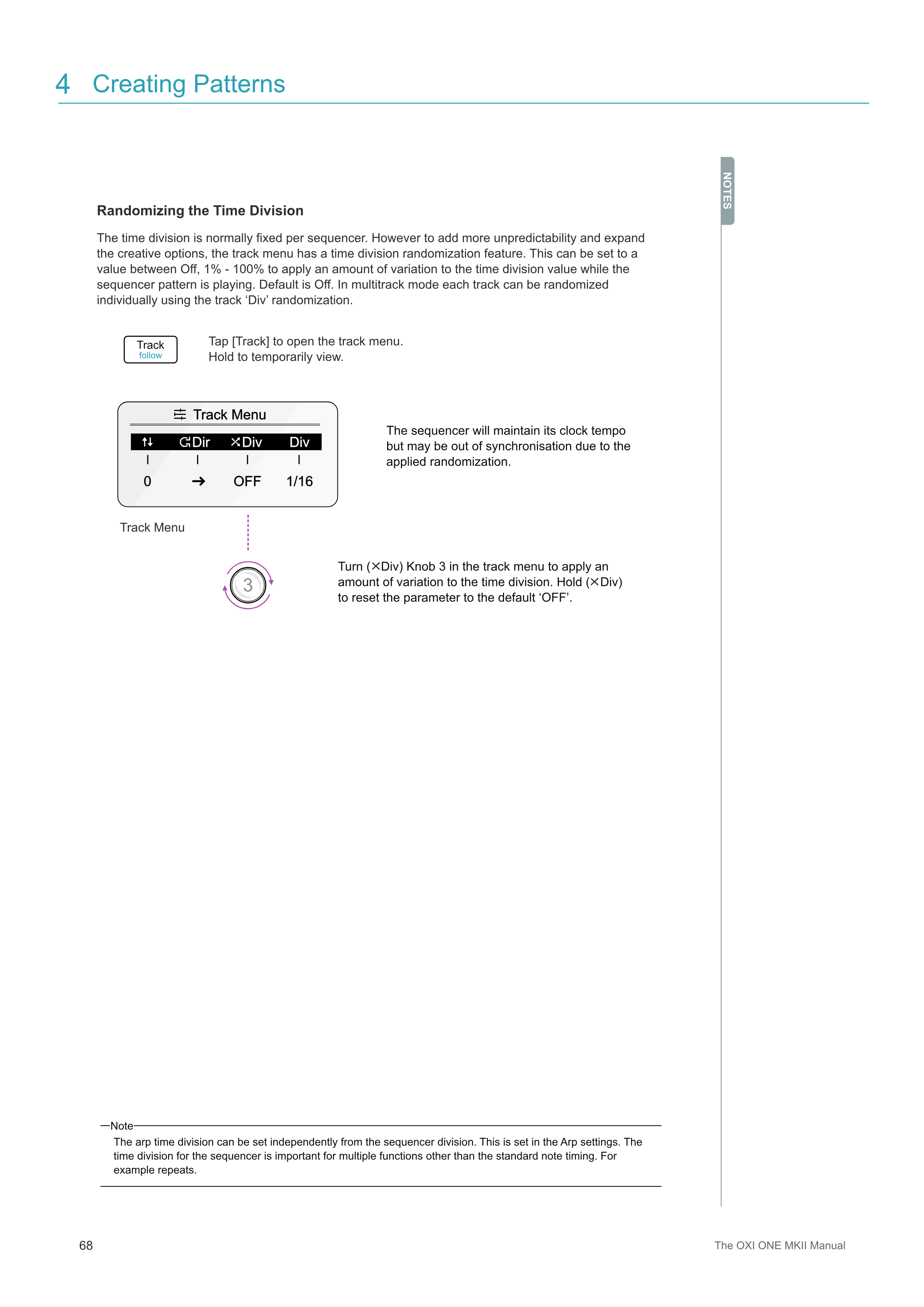 track menu内で(Div)Knob 3を回して、time divisionにばらつきの量を適用します。(Div)を押し続けると、パラメーターがデフォルトの'OFF'にリセットされます。