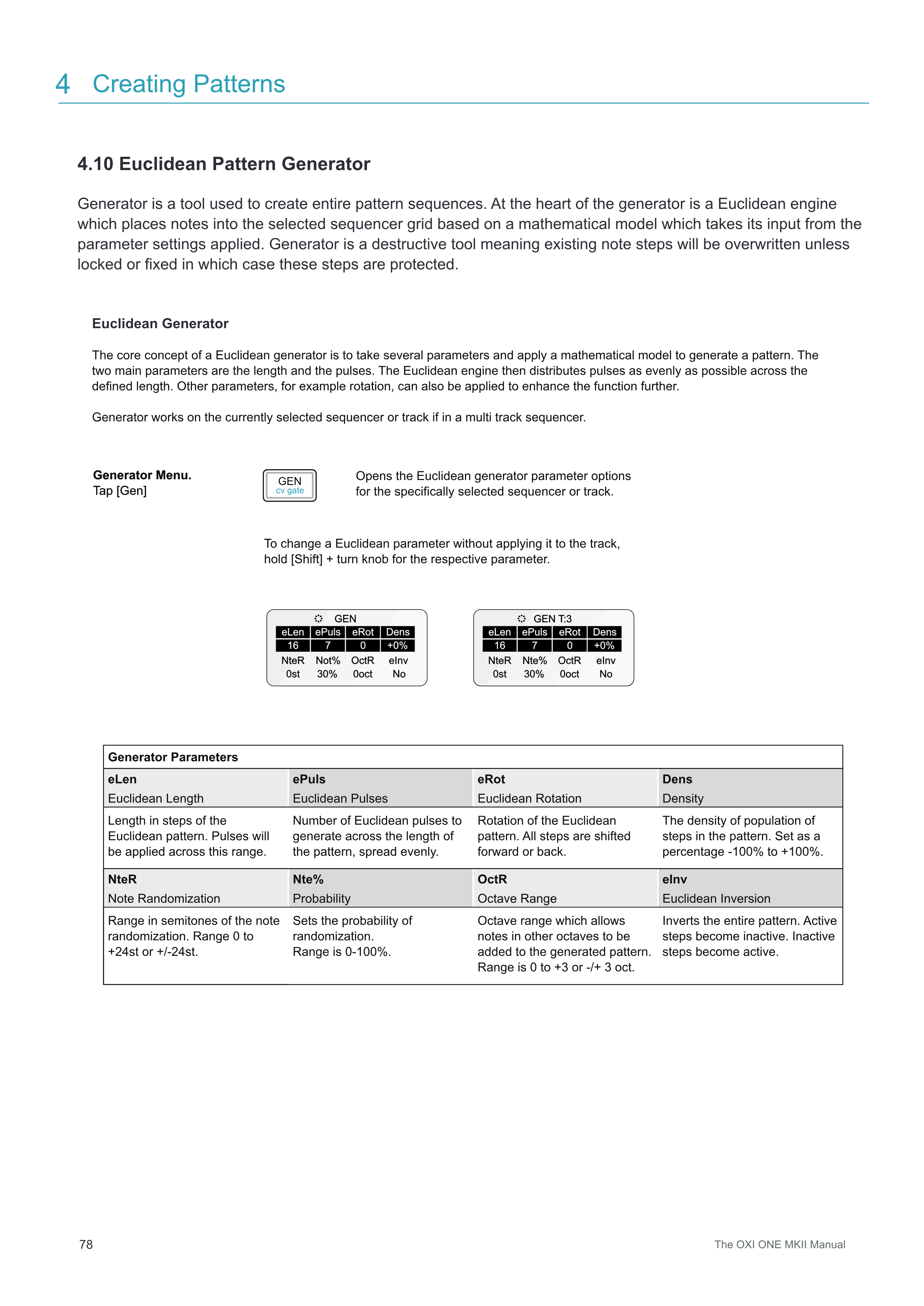 Generatorは、パターンシーケンス全体を作成するために使用されるツールです。generatorの中核となるのはEuclideanエンジンで、適用されたパラメーター設定から入力を受け取る数学的モデルに基づいて、選択されたsequencerグリッドにノートを配置します。Generatorは破壊的なツールです。つまり、既存のノートステップは上書きされますが、ロックまたは固定されている場合、これらのステップは保護されます。