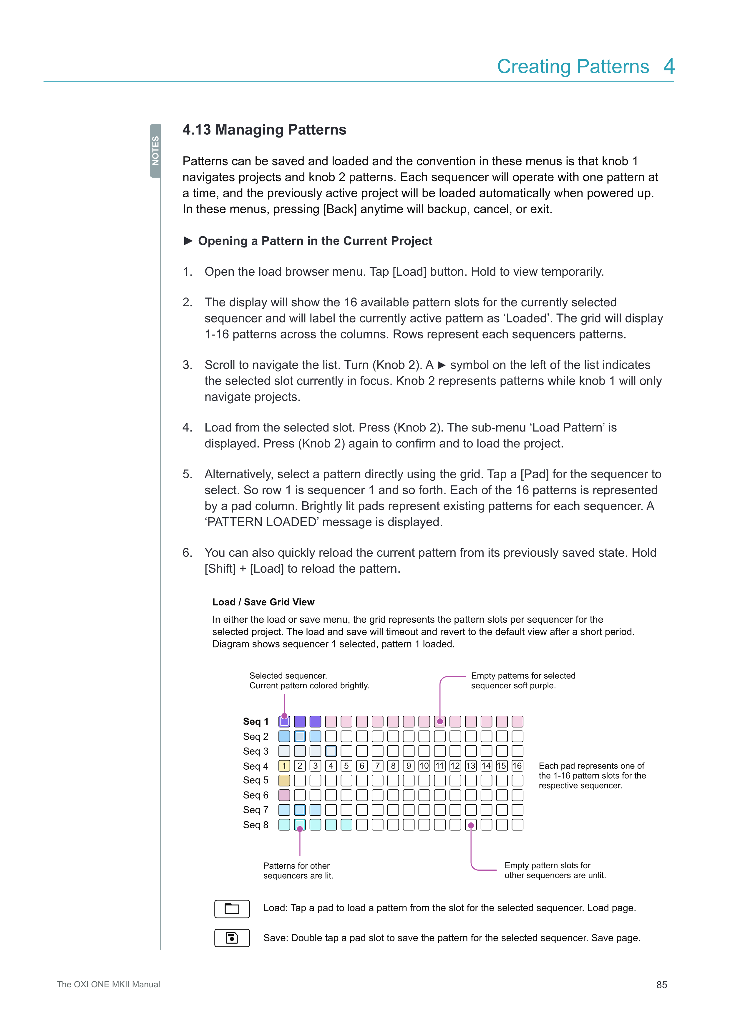 Patternは保存と読み込みが可能で、これらのメニューの規則として、knob 1でprojectを、knob 2でpatternを操作します。各sequencerは一度に1つのpatternで動作し、電源投入時には以前アクティブだったprojectが自動的に読み込まれます。