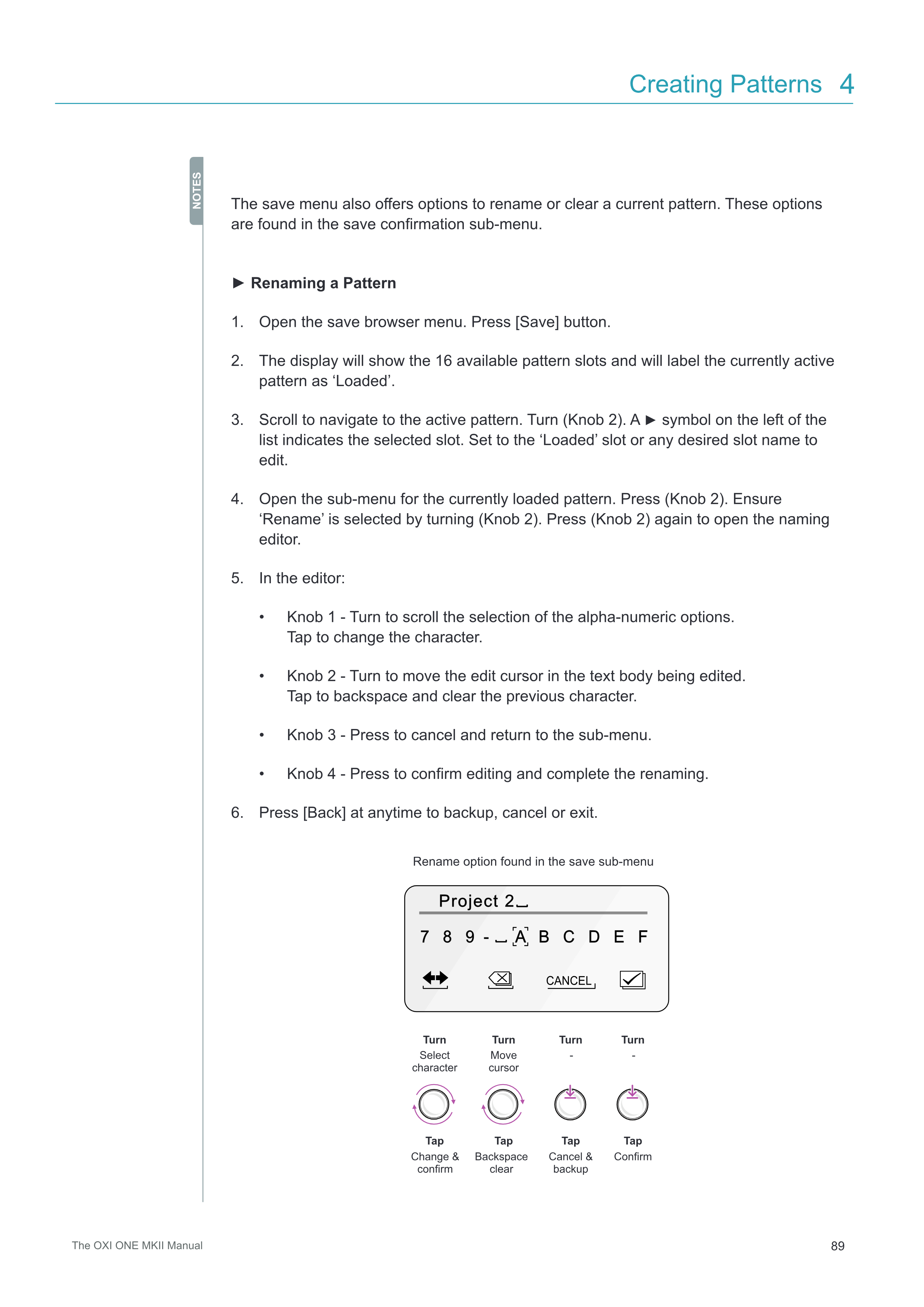 現在読み込まれているパターンのサブメニューを開きます。(Knob 2)を押します。(Knob 2)を回して「Rename」が選択されていることを確認します。(Knob 2)を再度押して名前編集エディタを開きます。
