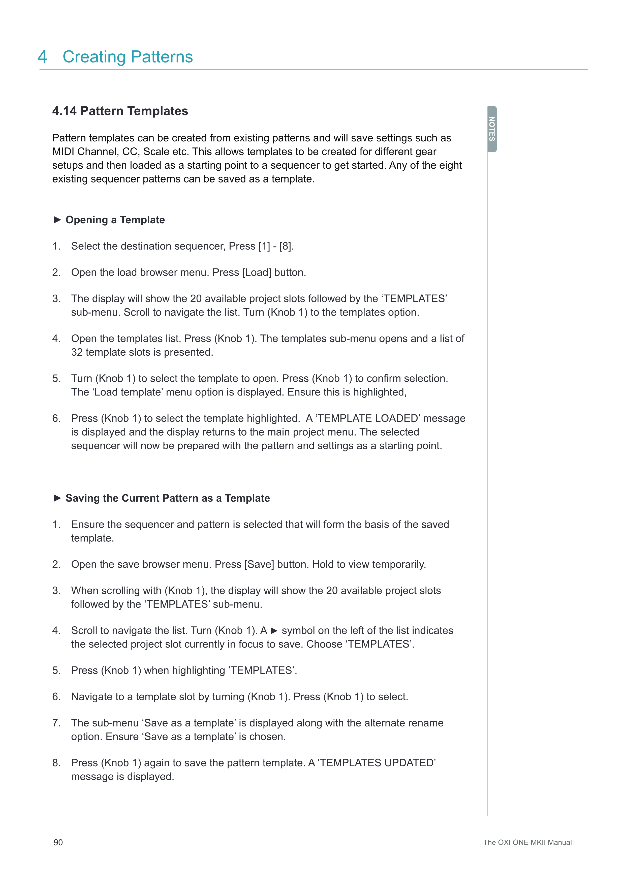 Pattern templatesは既存のパターンから作成でき、MIDI Channel、CC、Scaleなどの設定を保存します。これにより、異なる機材セットアップ用のtemplatesを作成し、sequencerの開始点として読み込んで作業を始めることができます。8つの既存sequencer patternsのいずれもtemplateとして保存できます。