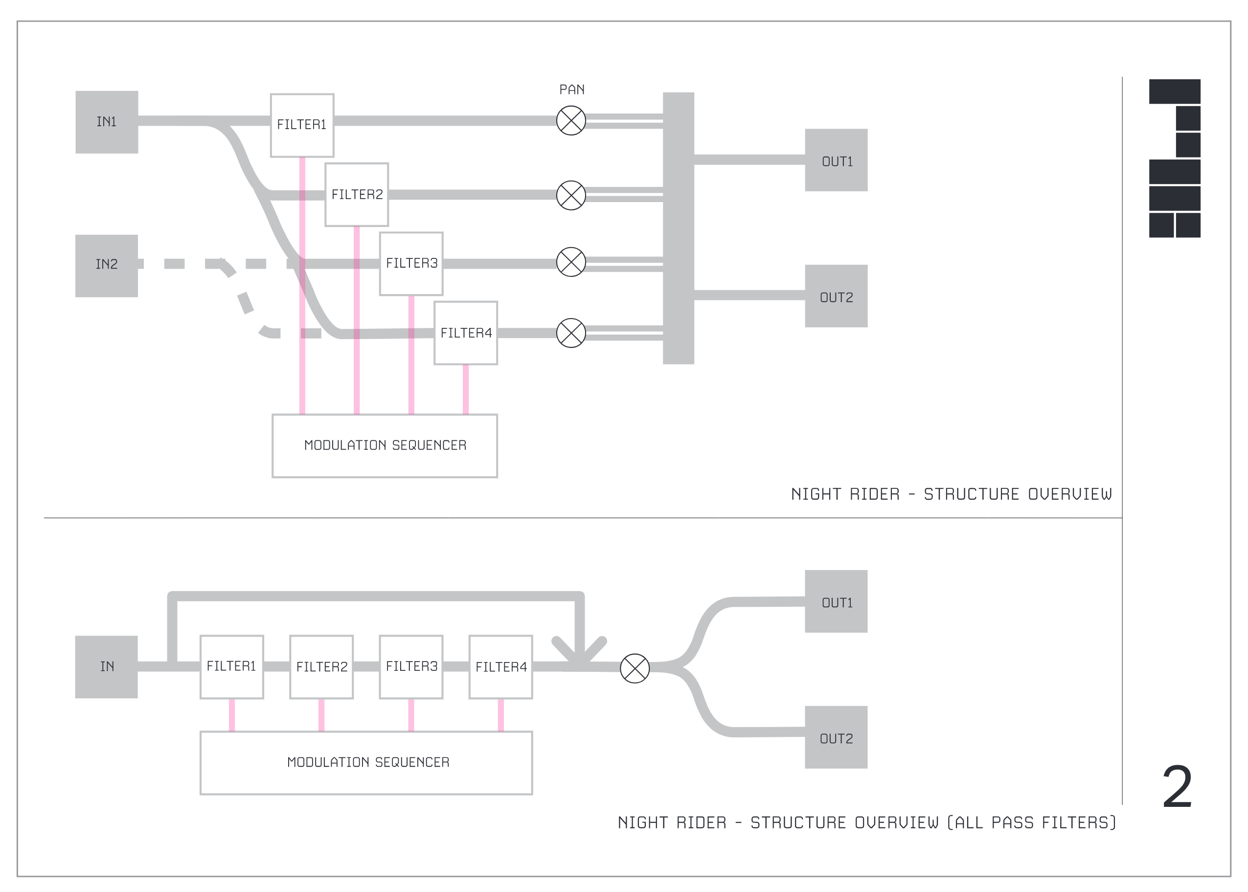 IN1とIN2の入力信号は、FILTER1、FILTER2、FILTER3、FILTER4の4つのフィルターを経由し、PANコントロールを通ってOUT1とOUT2へ出力されます。MODULATION SEQUENCERが各フィルターのパラメーターをモジュレートします。