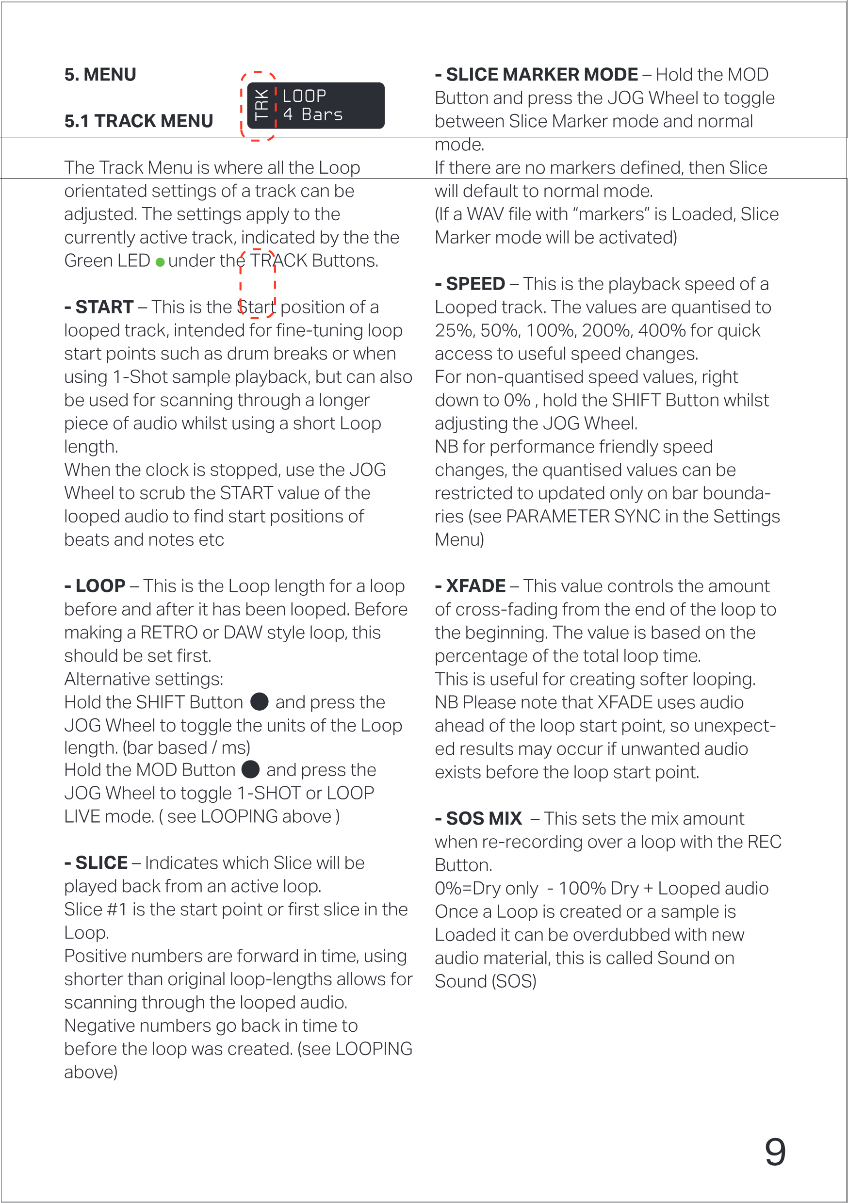 Track Menuでは、Trackのすべてのループ関連設定を調整できます。設定は、TRACK Buttonsの下にあるグリーンLED ● で示される、現在アクティブなTrackに適用されます。
