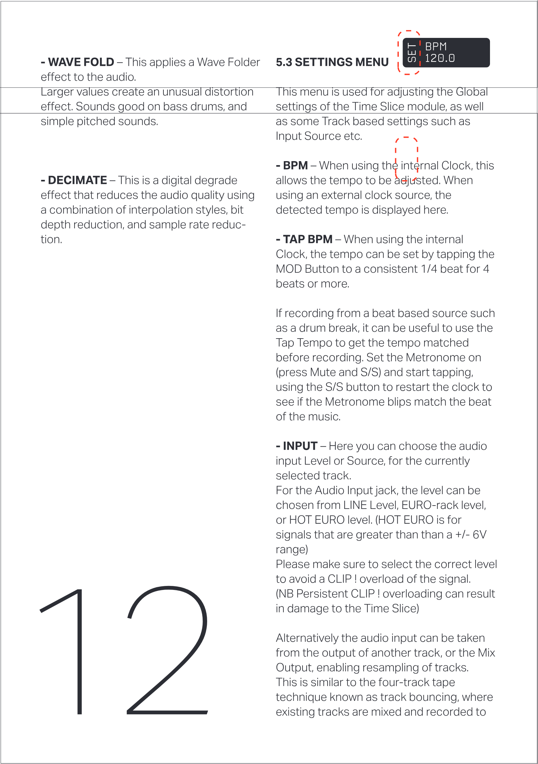 TAP BPM - 内部Clockを使用している場合、MOD Buttonを一定の1/4拍で4拍以上タップすることでテンポを設定できます。