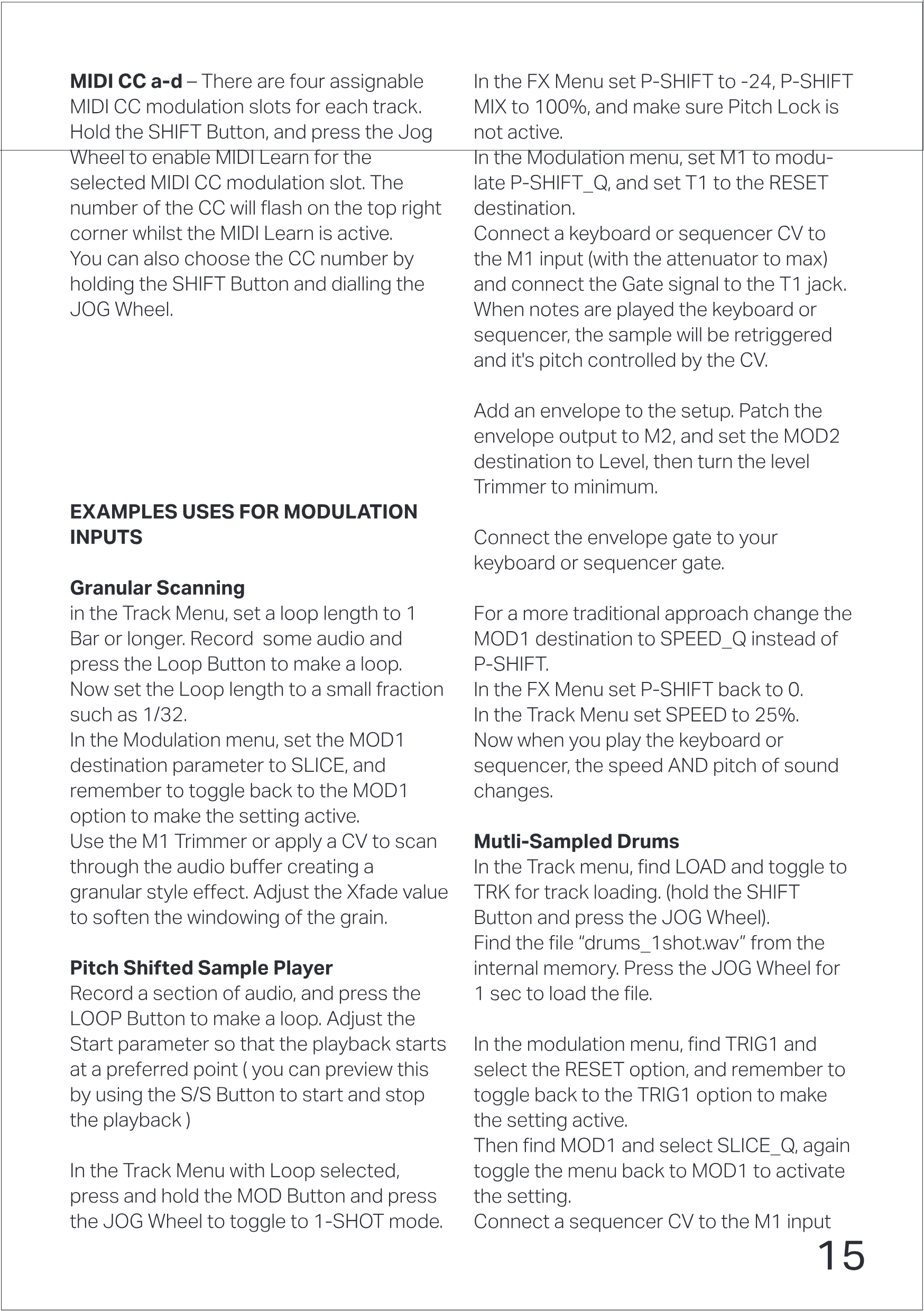 M1 TrimmerまたはCVを使用してオーディオバッファをスキャンし、Granularスタイルのエフェクトを作成します。Xfade値を調整してグレインのウィンドウイングを滑らかにします。