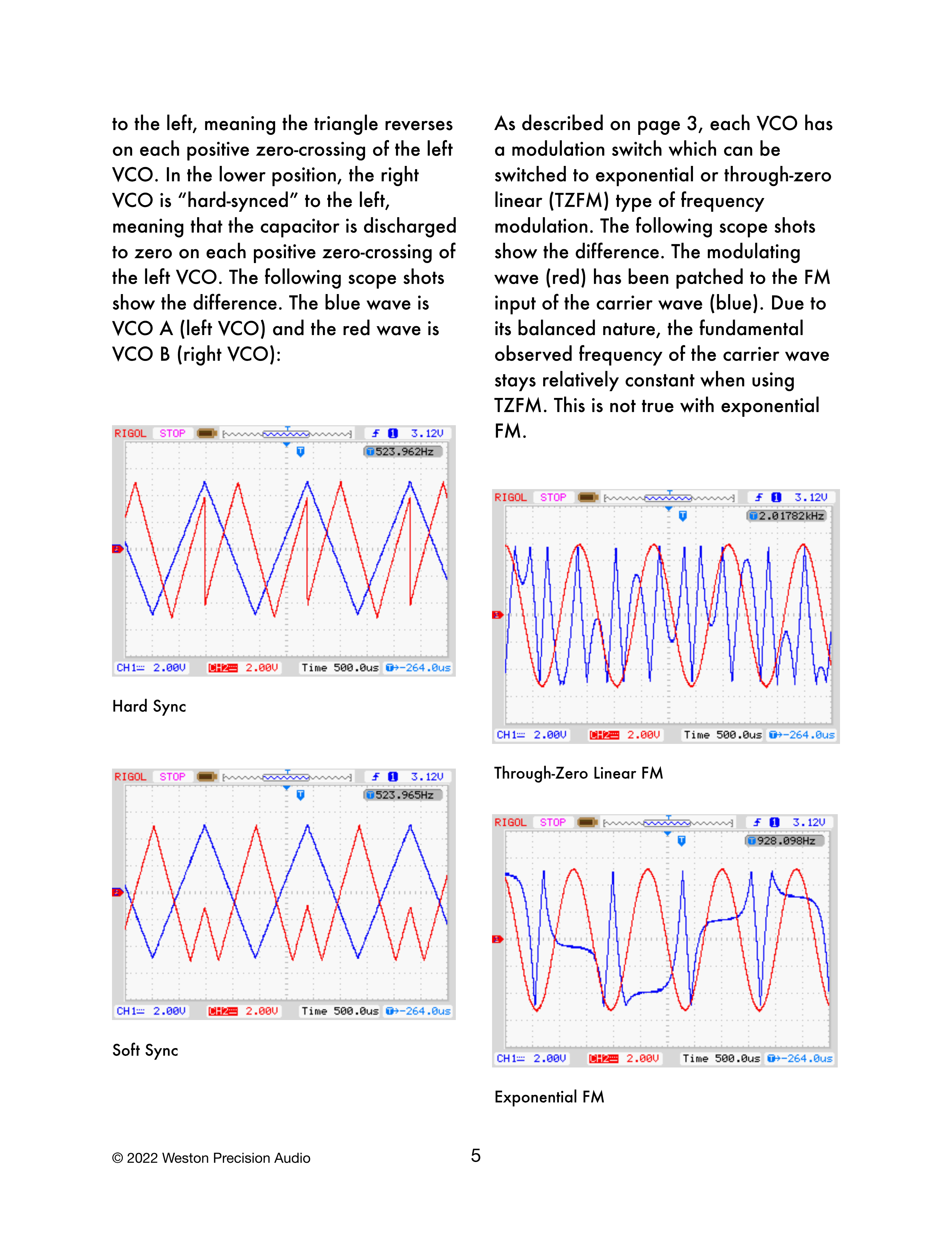 3ページで説明したように、各VCOにはモジュレーションスイッチがあり、エクスポネンシャルまたはスルーゼロリニア(TZFM)タイプの周波数モジュレーションに切り替えることができます。以下のオシロスコープの波形は、その違いを示しています。モジュレーション波(赤)は、キャリア波(青)のFM入力にパッチされています。そのバランスの取れた性質により、TZFMを使用した場合、キャリア波の観測される基本周波数は比較的一定に保たれます。これはエクスポネンシャルFMでは当てはまりません。
