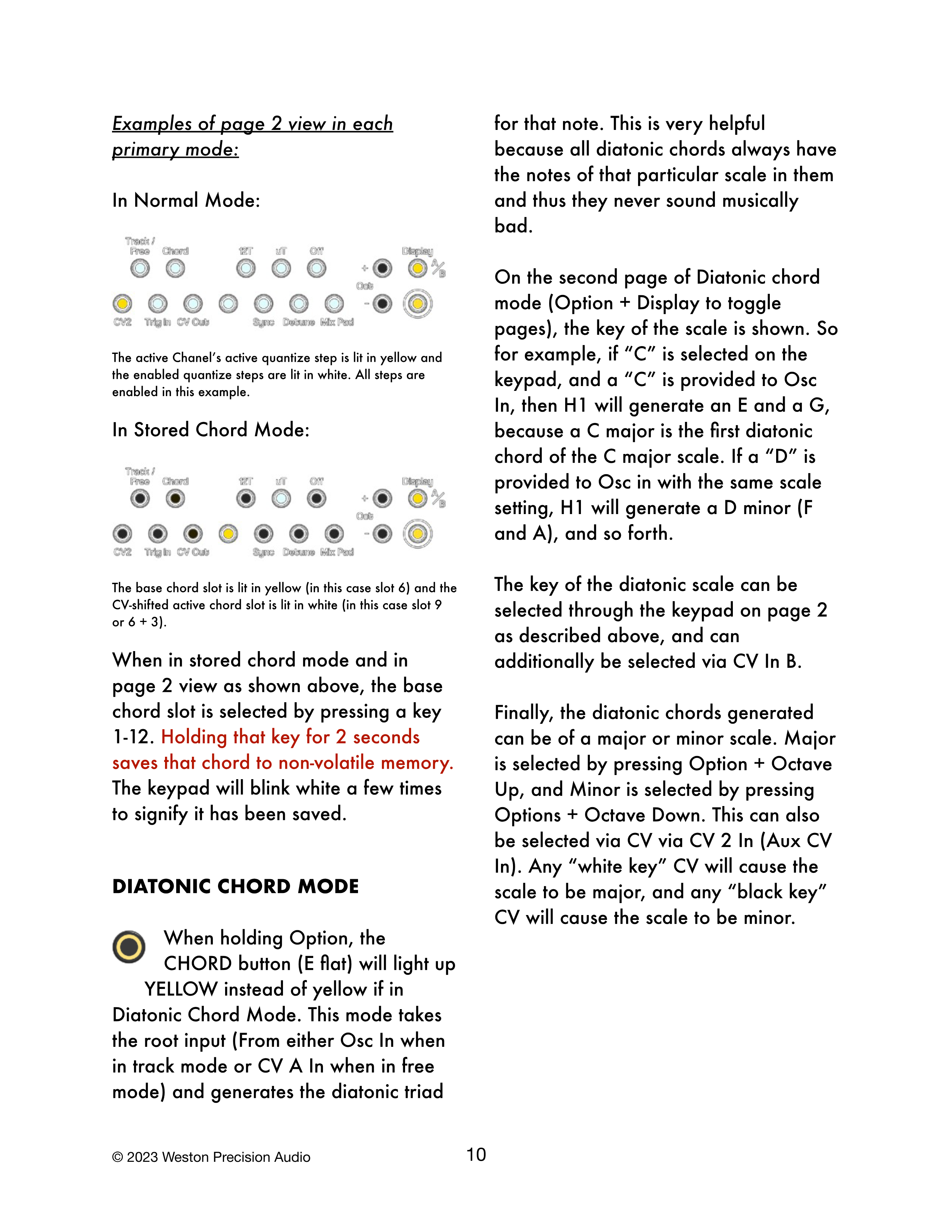 Optionを長押ししている時、CHORDボタン(E flat)はDiatonic Chord Modeの場合、黄色の代わりにYELLOWで点灯します。このモードは、ルート入力(TrackモードではOsc Inから、FreeモードではCV A Inから)を受け取り、そのノートのダイアトニックトライアドを生成します。これは非常に便利です。なぜなら、すべてのダイアトニックコードは常にその特定のスケールのノートを含んでおり、音楽的に悪い響きになることがないからです。