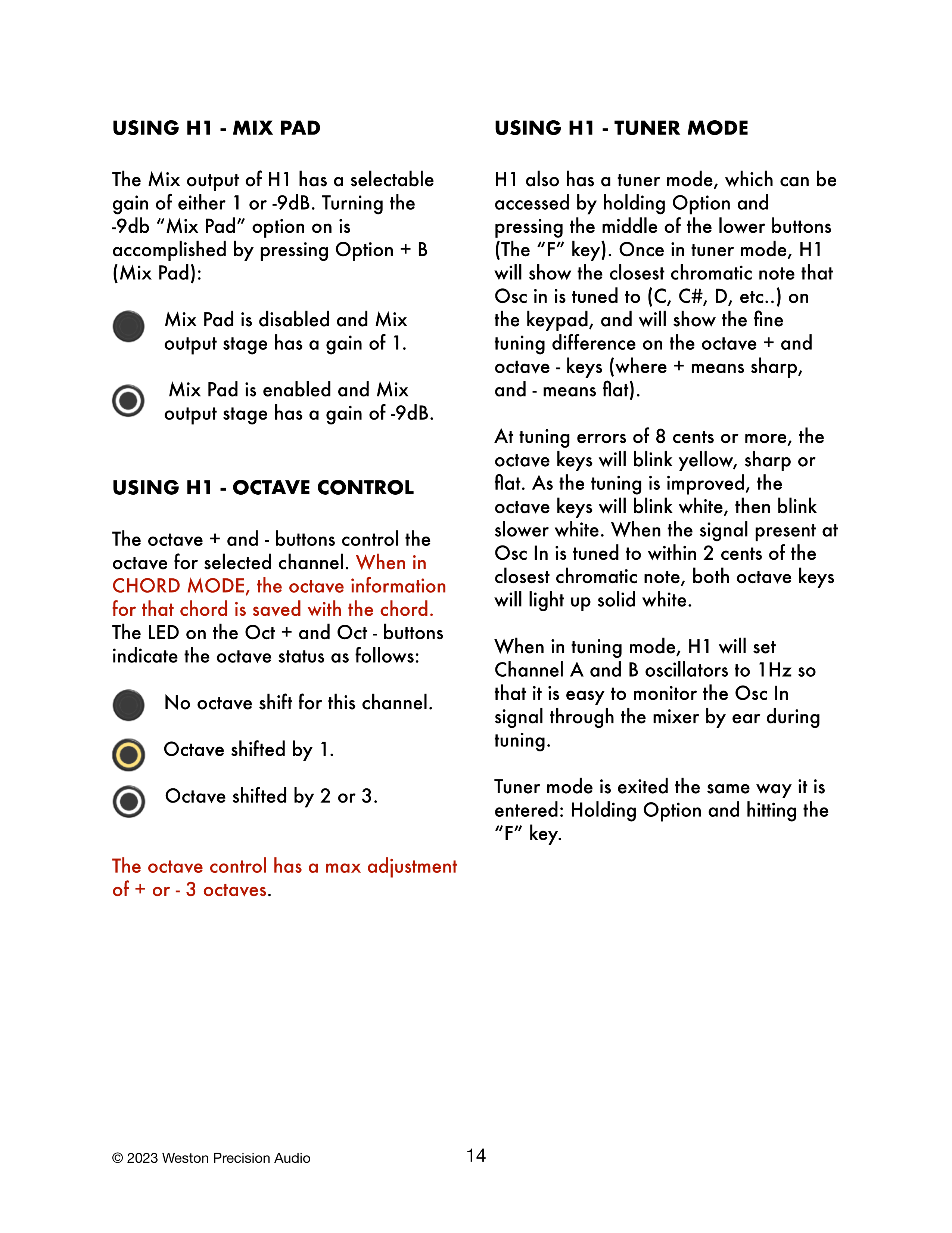 チューニング誤差が8セント以上の場合、octaveキーは黄色に点滅し、シャープまたはフラットを示します。チューニングが改善されると、octaveキーは白色に点滅し、その後ゆっくりと白色に点滅します。Osc Inに存在する信号が最も近い半音階の音符から2セント以内に調整されると、両方のoctaveキーが白色に点灯します。