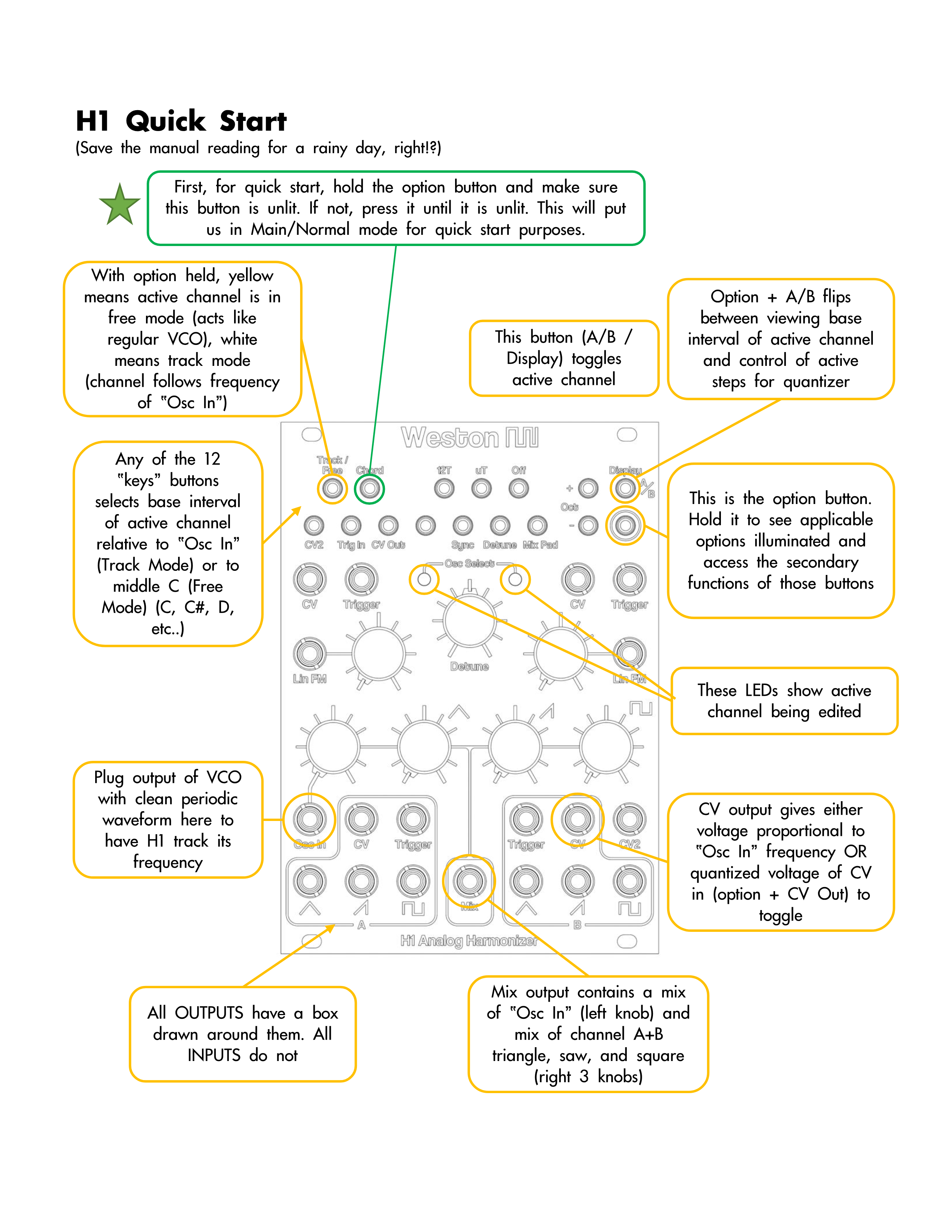 クリーンな周期的波形を持つVCOの出力をここにプラグインすると、H1がその周波数を追跡します。