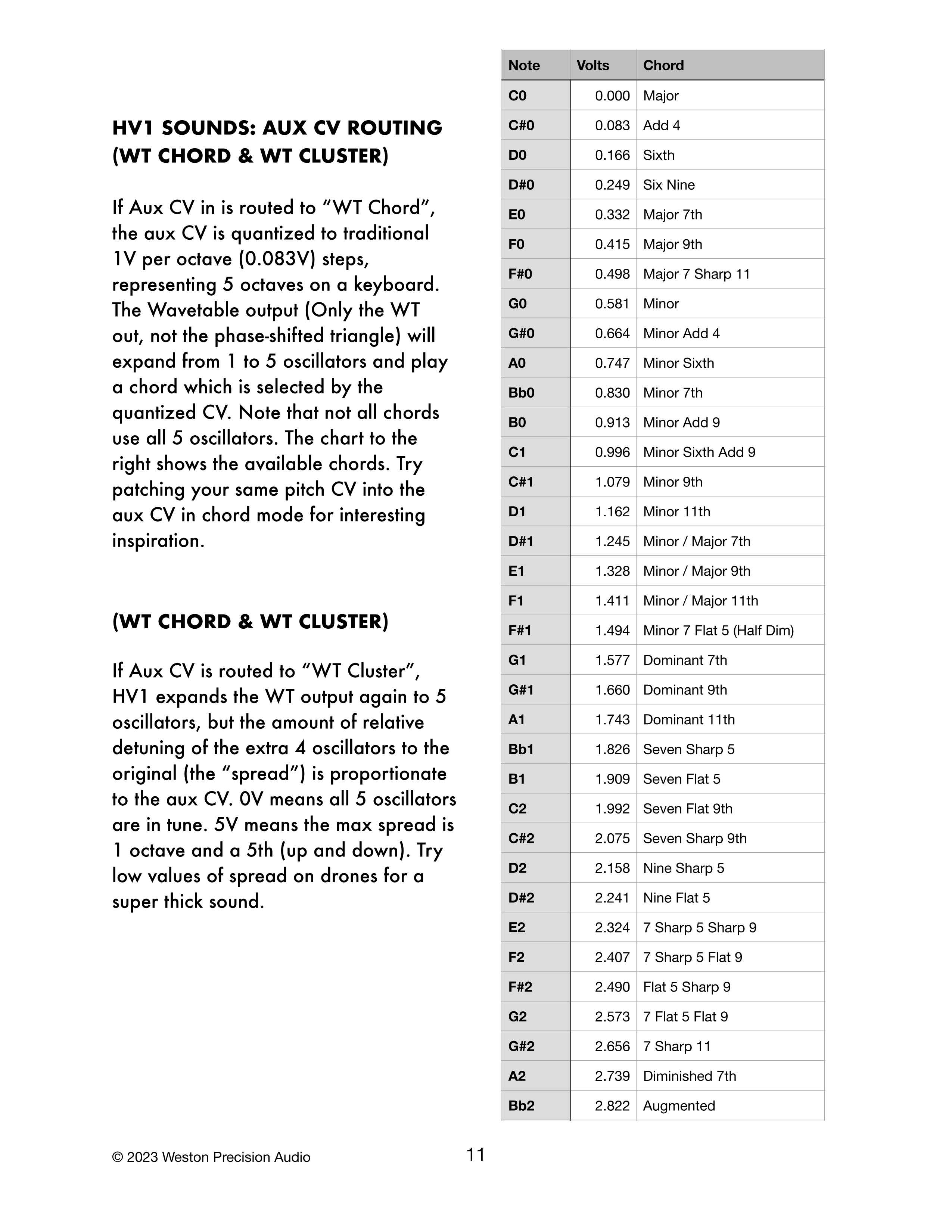 Aux CV入力が「WT Chord」にルーティングされている場合、AUX CVは従来の1V/オクターブ(0.083V)ステップにクオンタイズされ、キーボード上の5オクターブを表します。