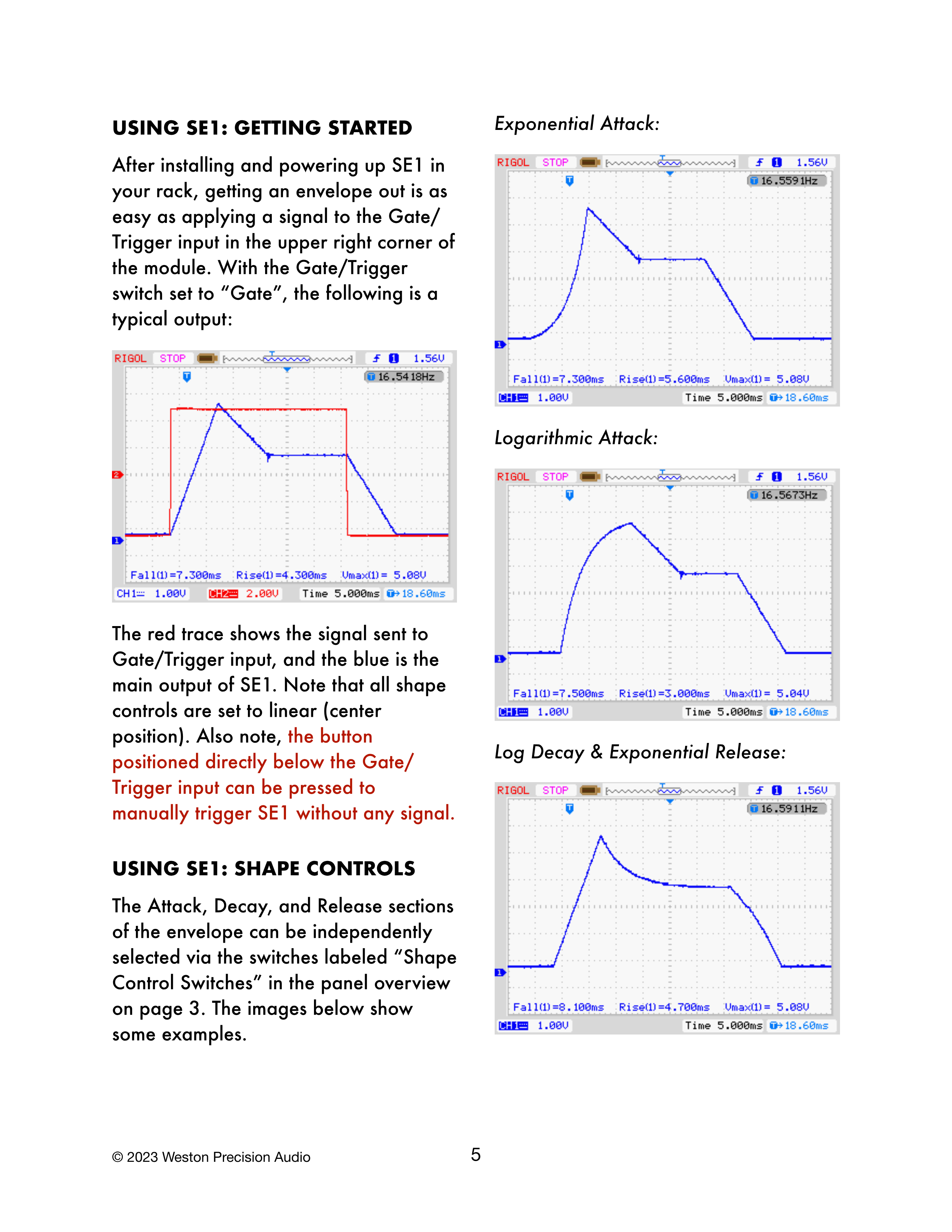 赤いトレースはGate/Trigger入力に送られた信号を示し、青はSE1のメイン出力です。すべてのShapeコントロールはLinear(中央位置)に設定されています。また、Gate/Trigger入力の真下にあるボタンを押すことで、信号なしで手動でSE1をトリガーできます。