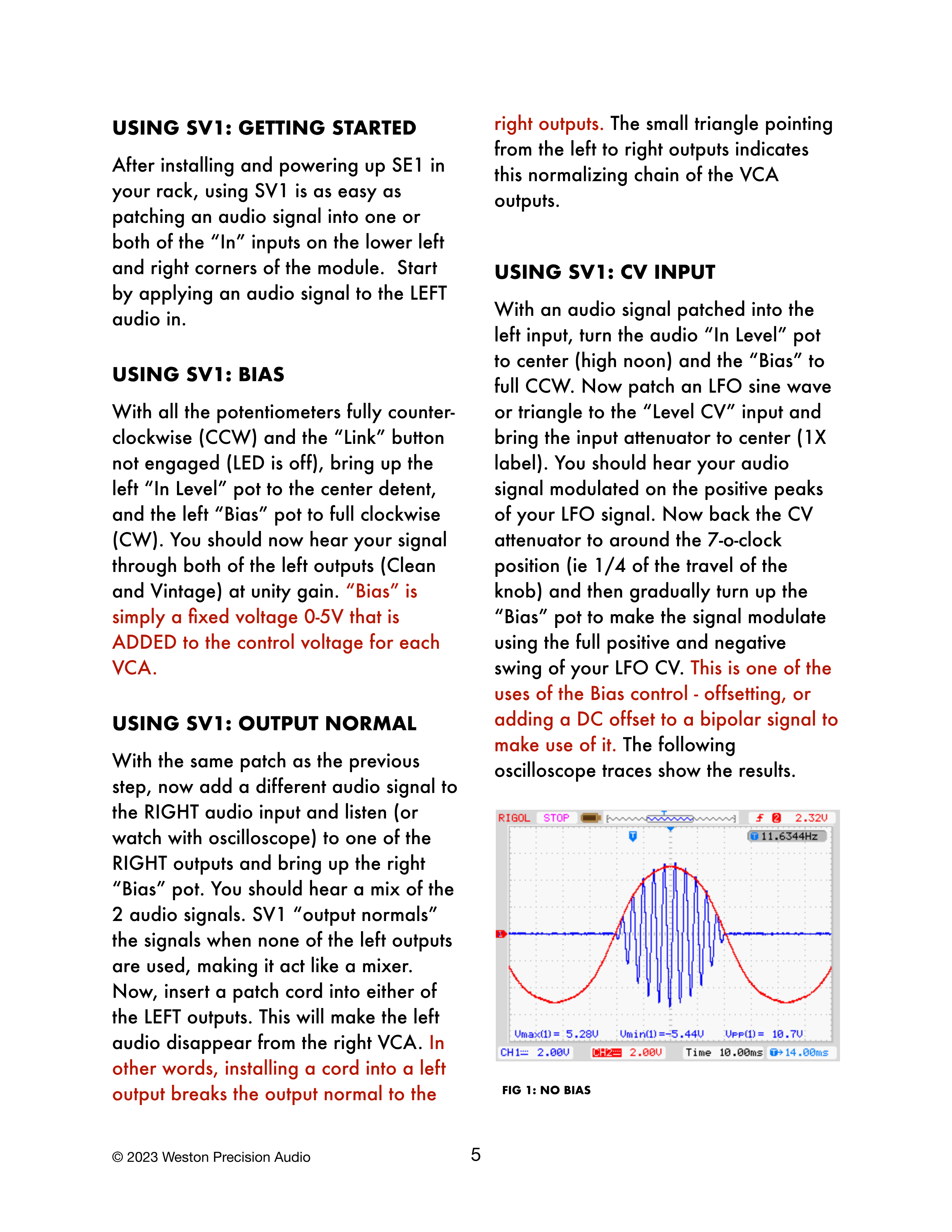 前のステップと同じパッチで、右側のオーディオ入力に別のオーディオ信号を追加し、右側の出力のいずれかをリスニング(またはオシロスコープで観察)しながら、右側の「Bias」ポットを上げます。2つのオーディオ信号のミックスが聞こえるはずです。SV1は左側の出力が使用されていない場合に信号を「output normal」し、ミキサーのように動作します。